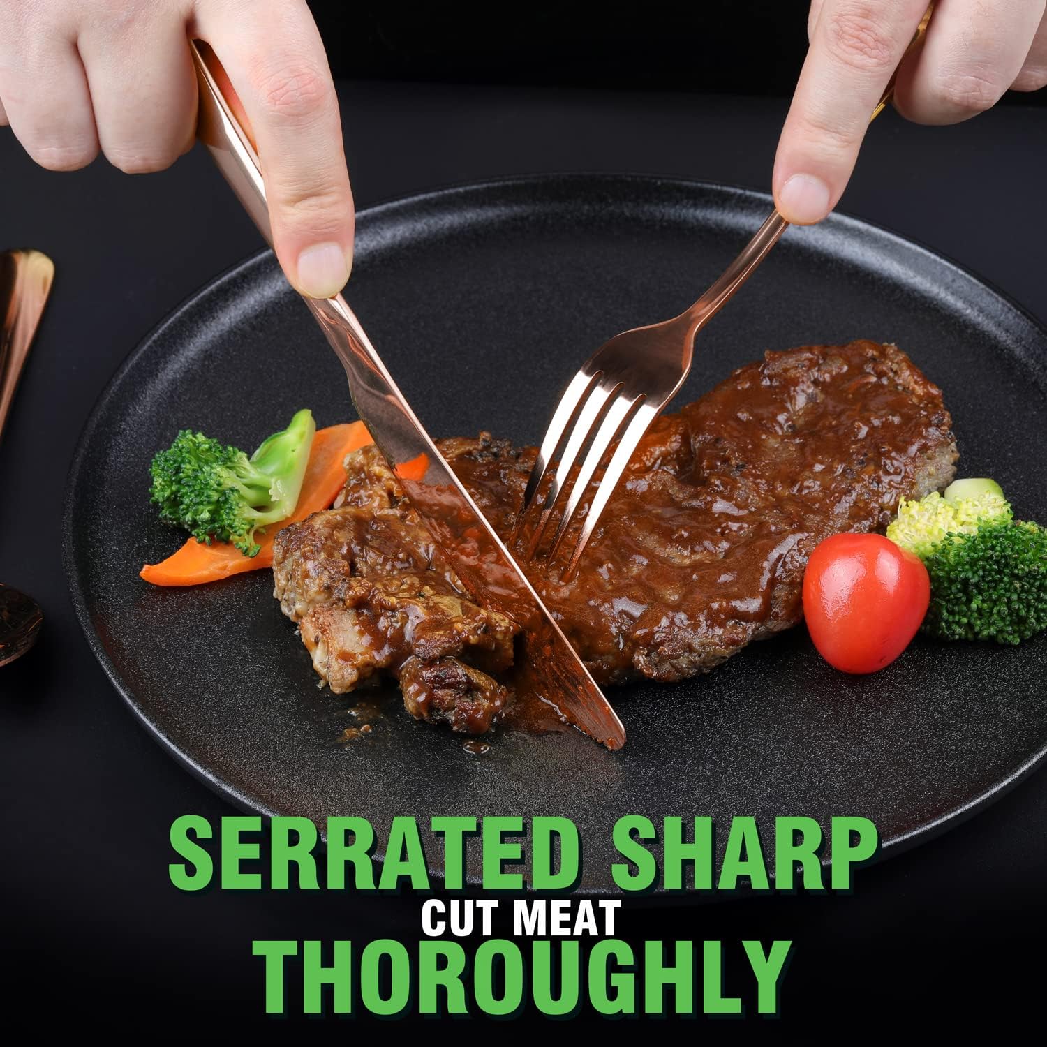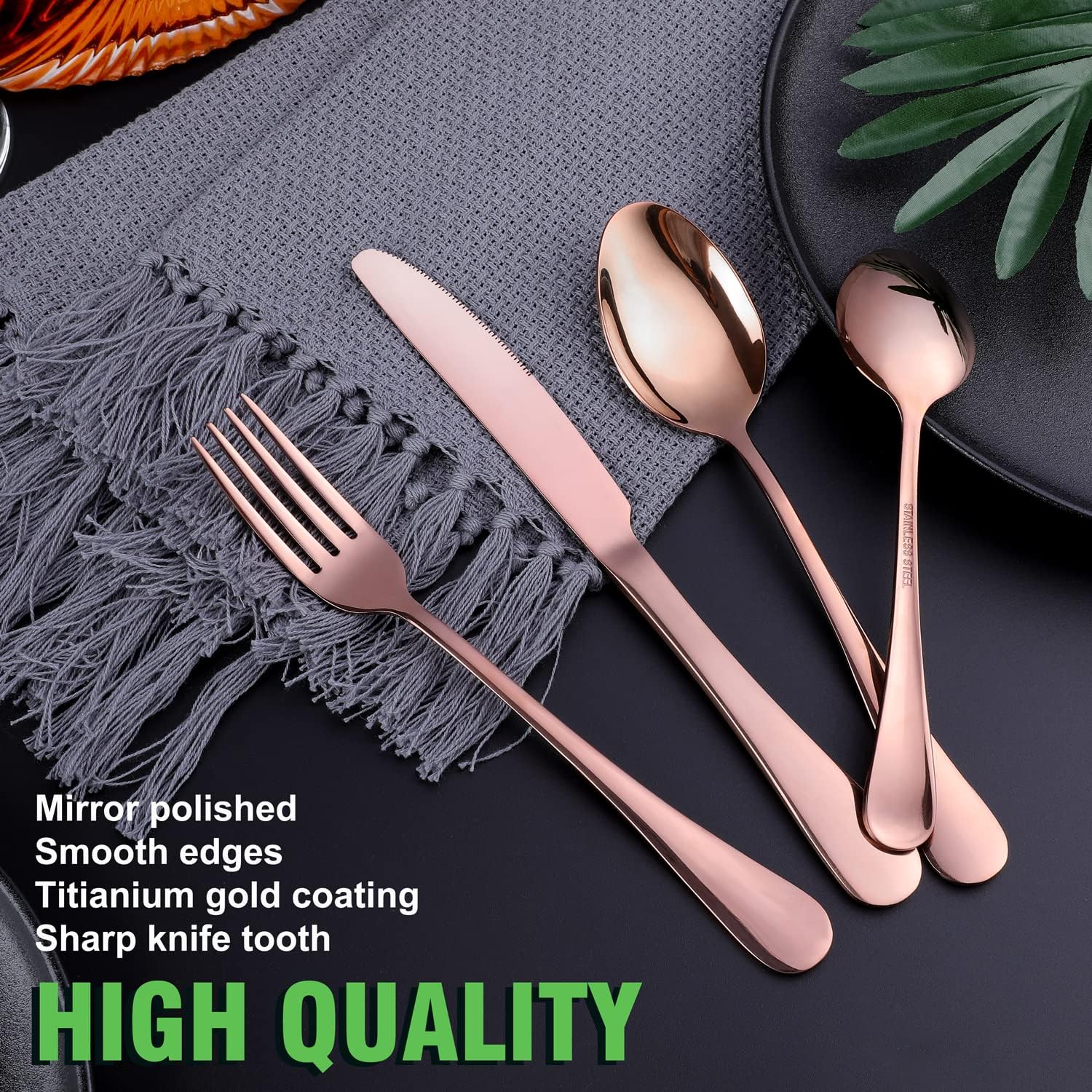 - 【FOOD-GRADE 18/8 STAINLESS STEEL】: The Rose gold flatware set is made of 18/8 stainless steel which is durable and corrosion-resistant, rust-proof, non-toxic, BPA-free, healthy for your daily use. At the same time, good sturdiness ensures that it will not bend easily and always maintain a beautiful appearance.