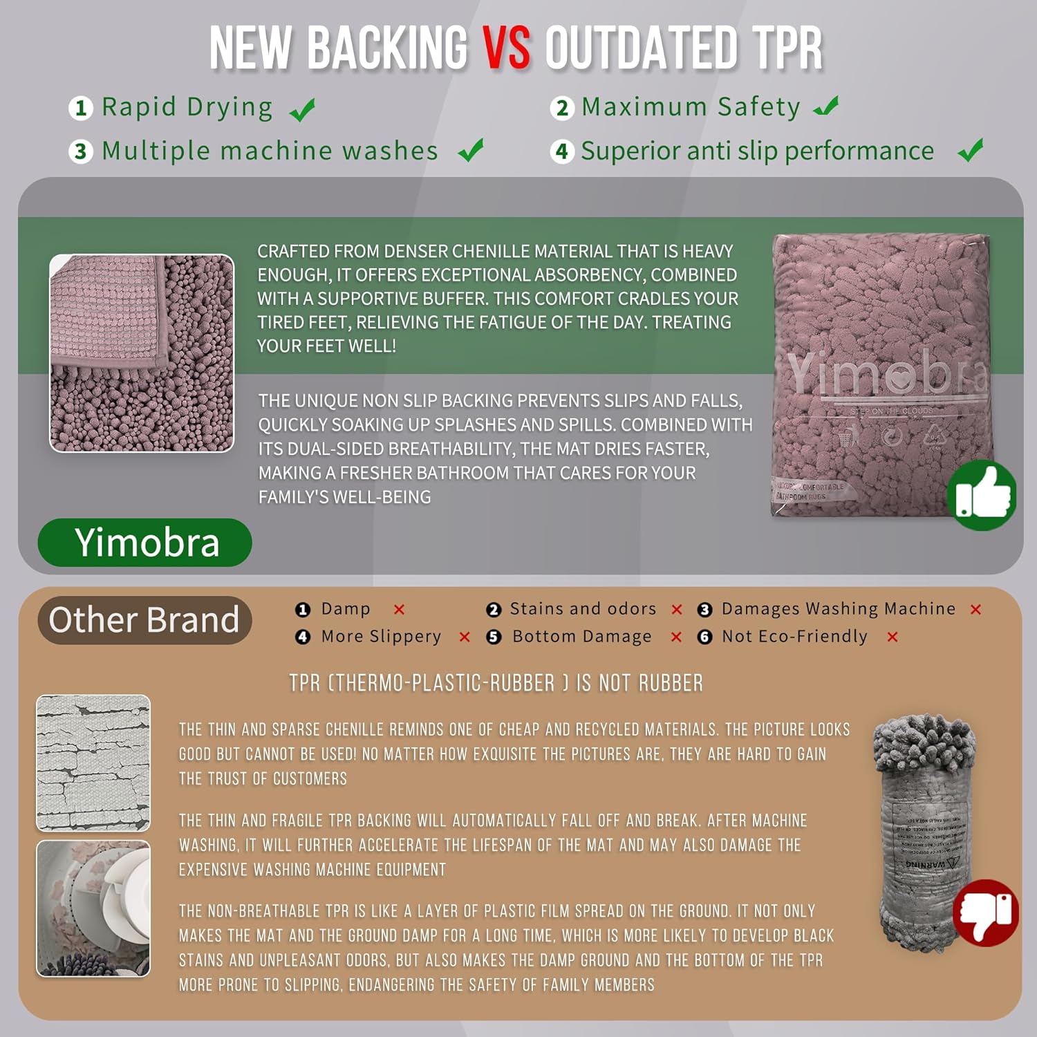 - Total Grip Safety & Quick Dry: Yimobra bath rug features a feather-light yet ultra-grippy hot-melt backing that stays firmly in place on wet surfaces. Its vertical air-channel chenille fibers ensure rapid and complete dryness, providing instant dry safety the moment you step out of the shower. The product is tested for harmful substances, performance, longevity, and emissions in accordance with the OEKO-TEX Standard 100