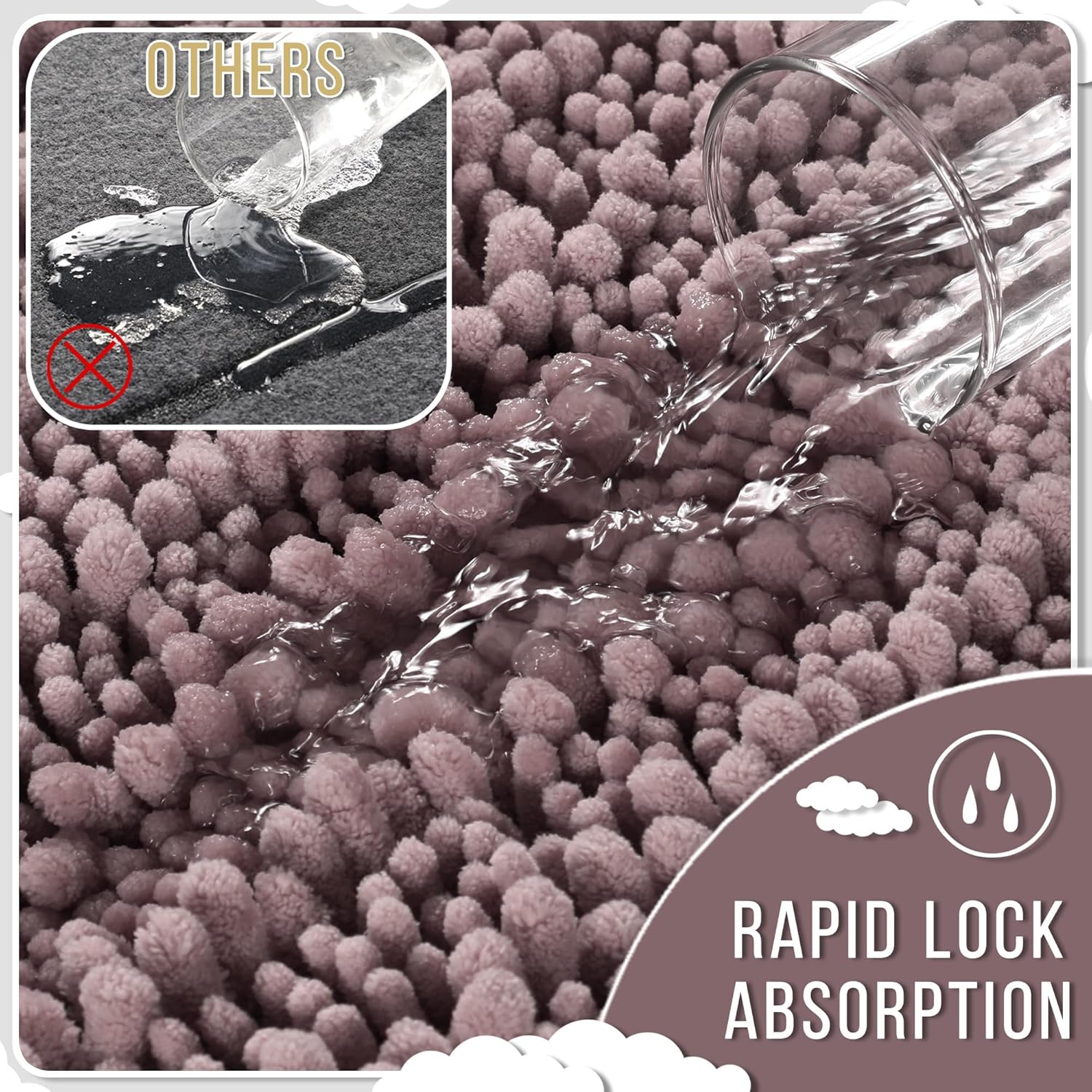 - Massive Water Absorption in Seconds: 5X faster than other materials mats, Yimobra bath mat absorbs 1000ml of water in 3 seconds. The vertical fiber channels lock moisture away from the surface, keeping your bathroom floor dry and discouraging damp environments. Perfect as a shower exit guard or sink splash catcher