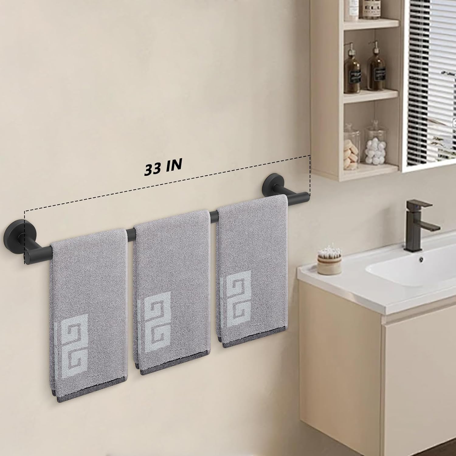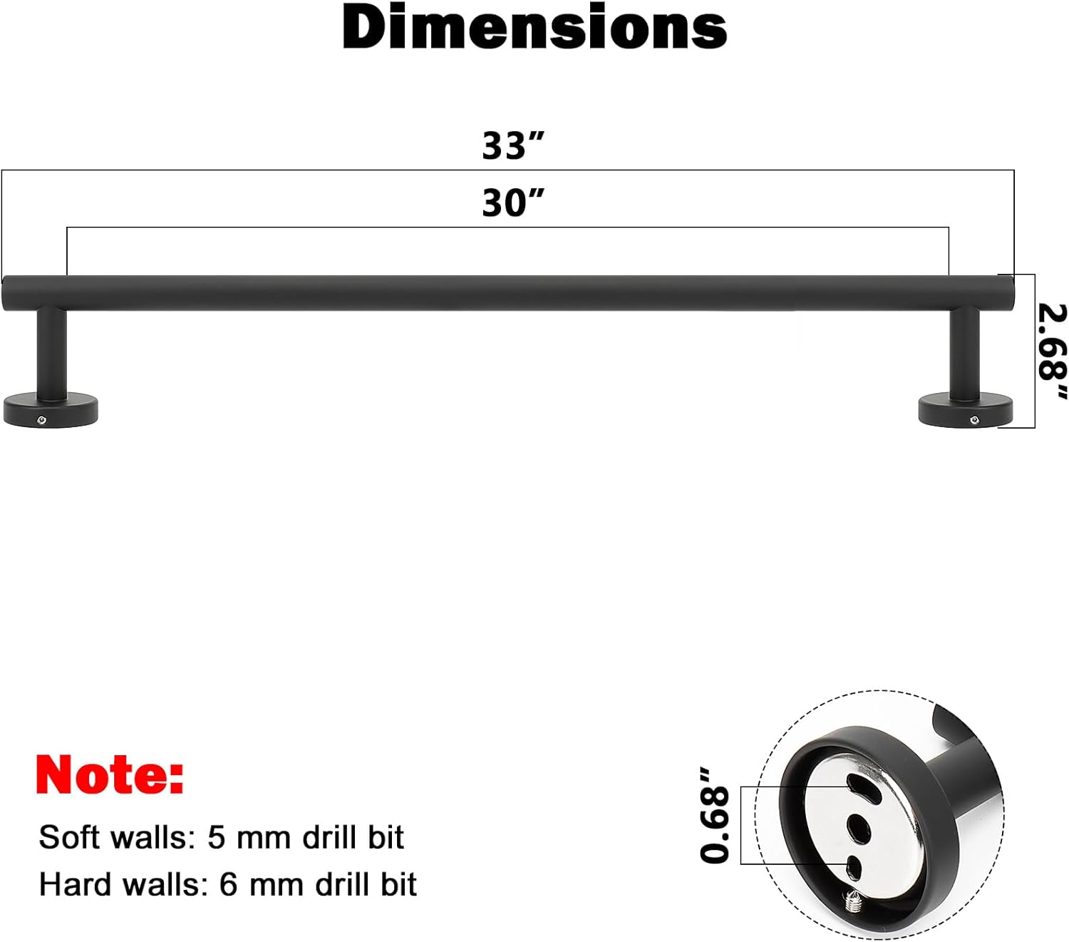 - DIMENSIONS & USE: Overall length is 33" (838mm). The length of hanging space is30" (770mm). 22-Lbs (10kgs) max weight capacity. You can mount this towel bar to either side of your cabinet or closet door for storing at-use hand and dish towels. It can also be used with S hooks, hanging bath balls, hair dryers, tea cups, spoons, clips, etc.
