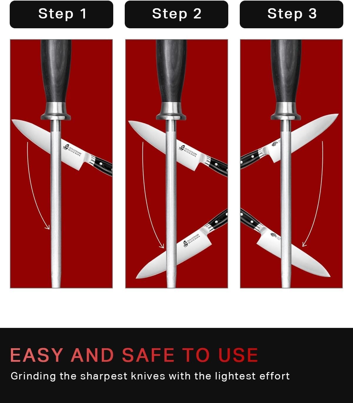 - PROFESSIONAL HONING STEEL: Our knife honing rod is your all-in-one solution for keeping every kitchen knife razor-sharp. From chef's knives to boning knives, cleavers, and paring knives, this honing steel ensures lasting sharpness across your entire collection—ideal for home and professional use.