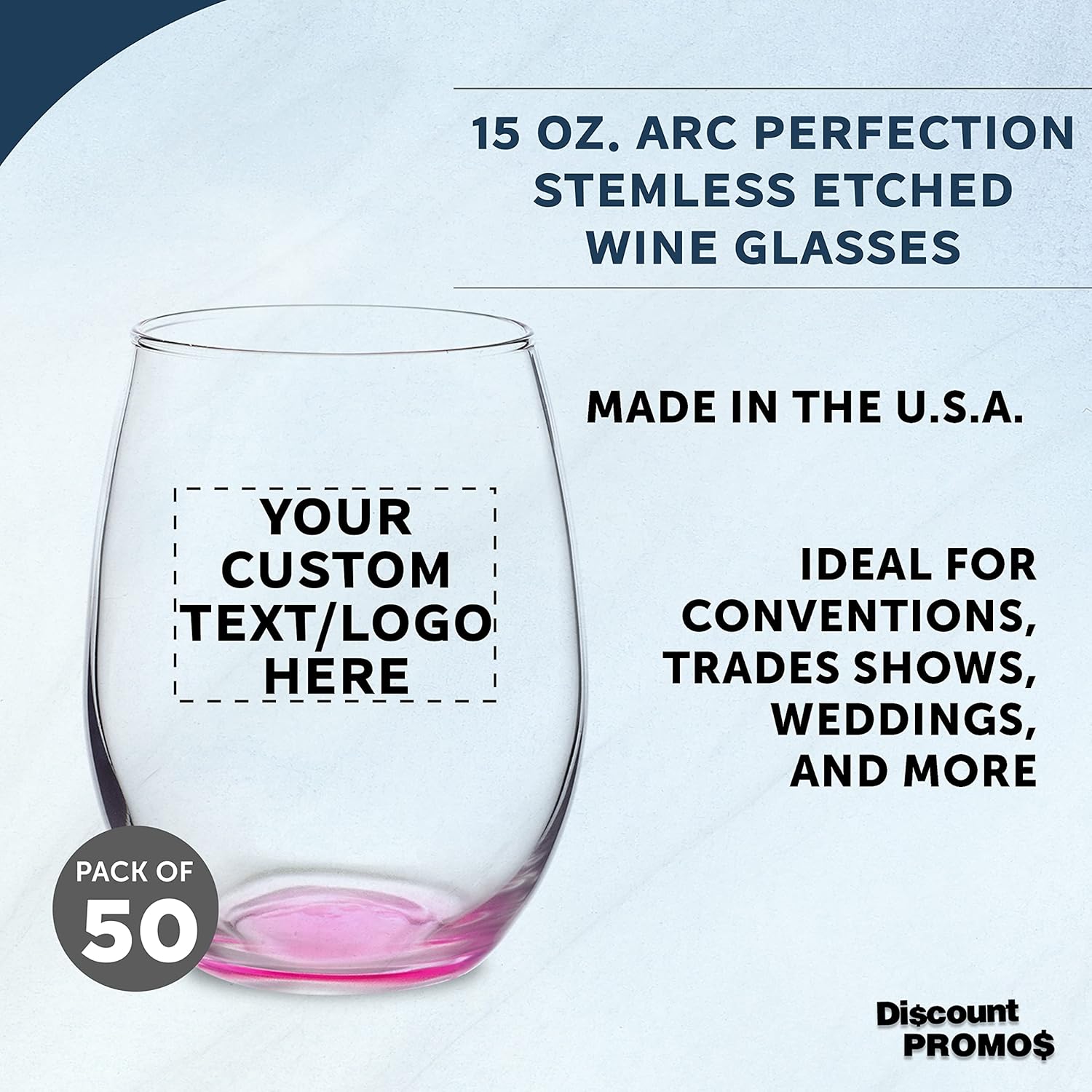 Custom Stemless Wine Glasses in Bulk by ARC Perfection, 15 oz, 50 pack, Personalized Text, Logo, Red or White Wine Glass Set, Pink