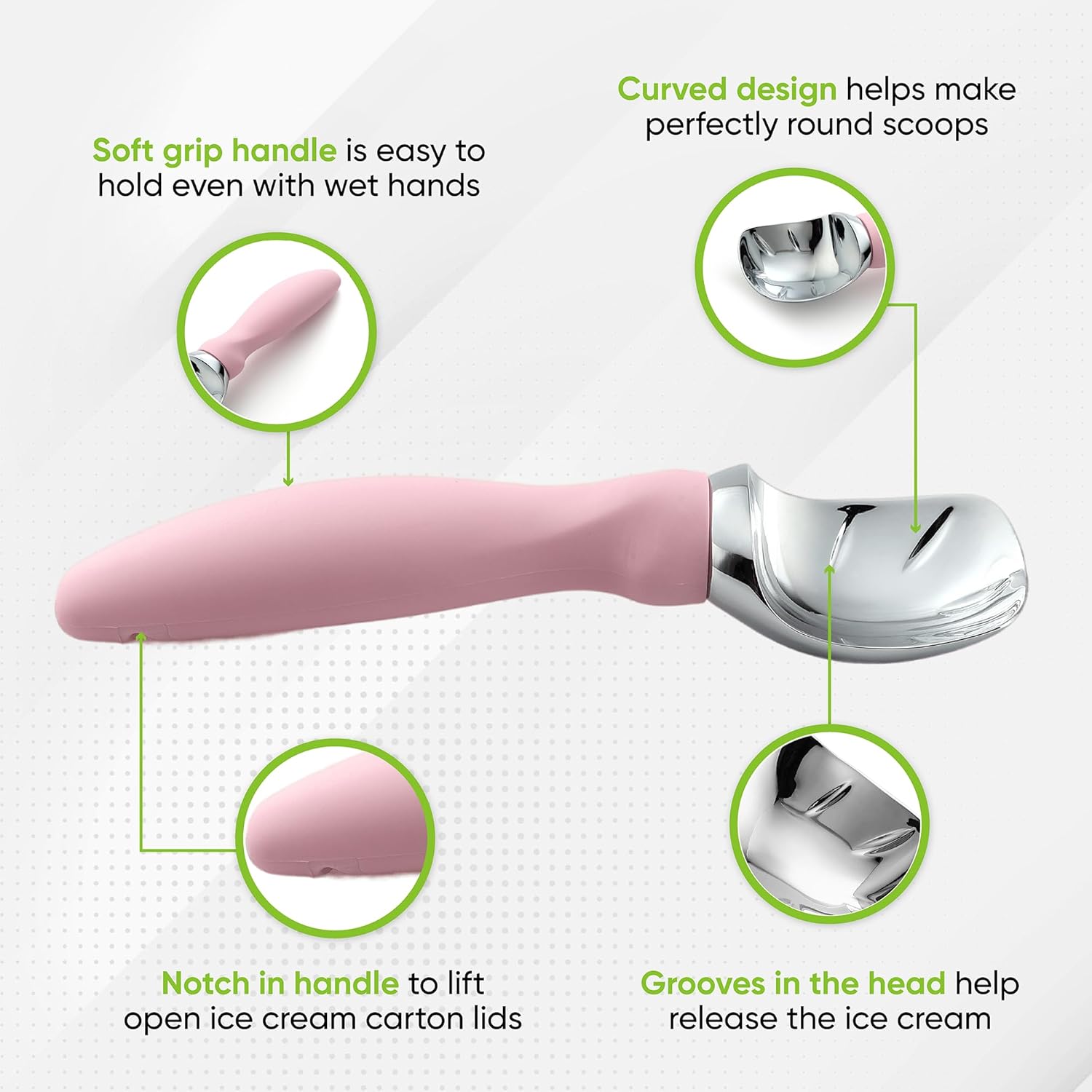 - Why Struggle With A Bad Scoop - With its pleasant weight, ability to get into hard-to-reach parts of a carton and excellent handling of hard ice cream, Spring Chefβs scoop does the heavy lifting. The soft grip handle is comfortable to hold, easy to grip, absorbs pressure and doesn't freeze your hand like scoops with a metal handle can. No antifreeze gimmicks. Simple yet ergonomic design that is easy to clean and will make scooping even easier.