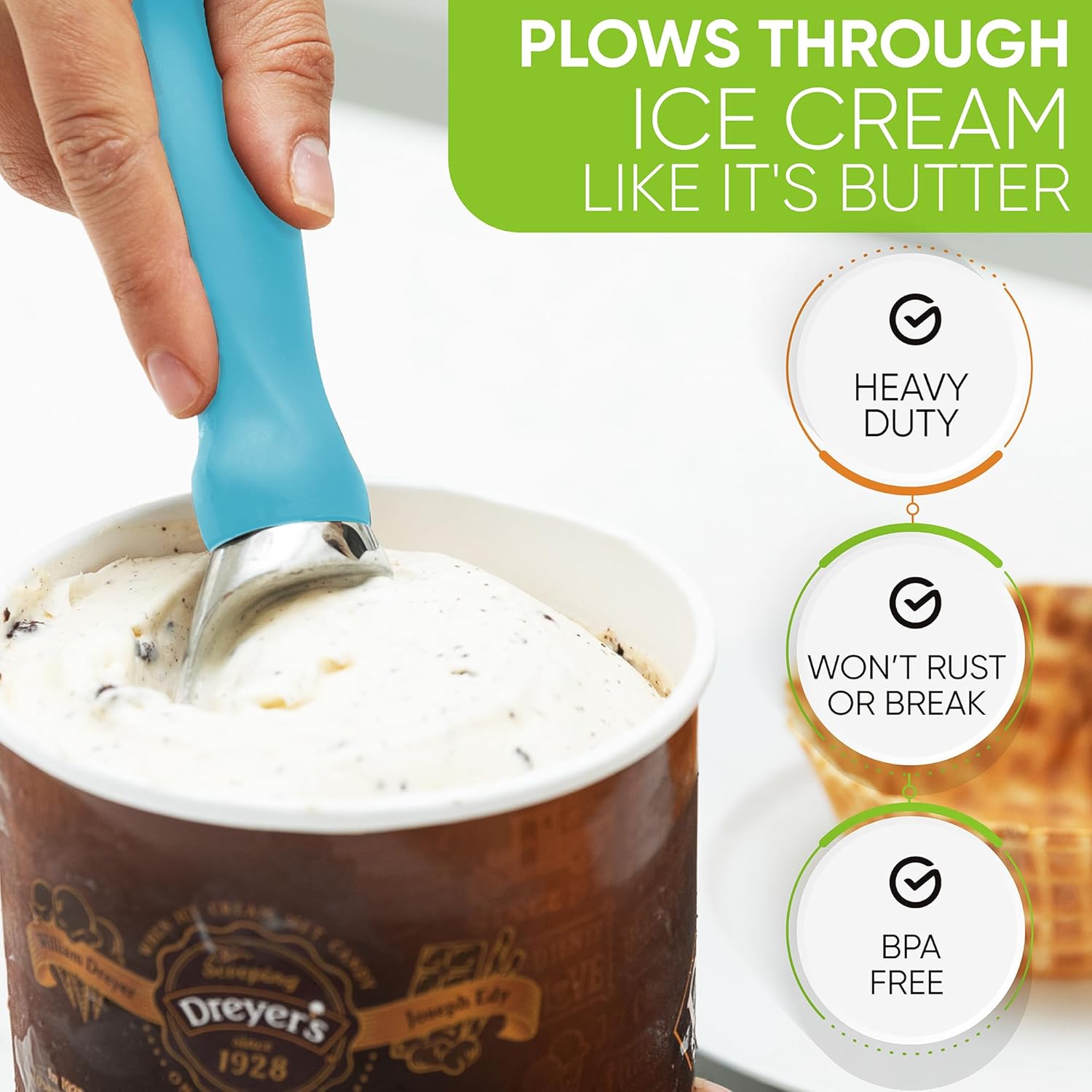 - Plows Through Ice Cream Like It's Butter - Glides smoothly and easily through hard-packed frozen sweets. It will seem like ice cream flows right into the scoop and drops into your bowl or cone with little to no effort.