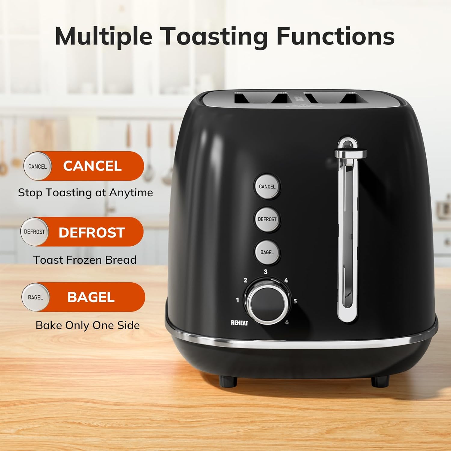 Retro Stainless Steel 2 Slice Toaster - Bagel, Cancel, Defrost Functions, 6 Shade Settings, Extra Wide Slot, Removable Crumb Tray (Black)