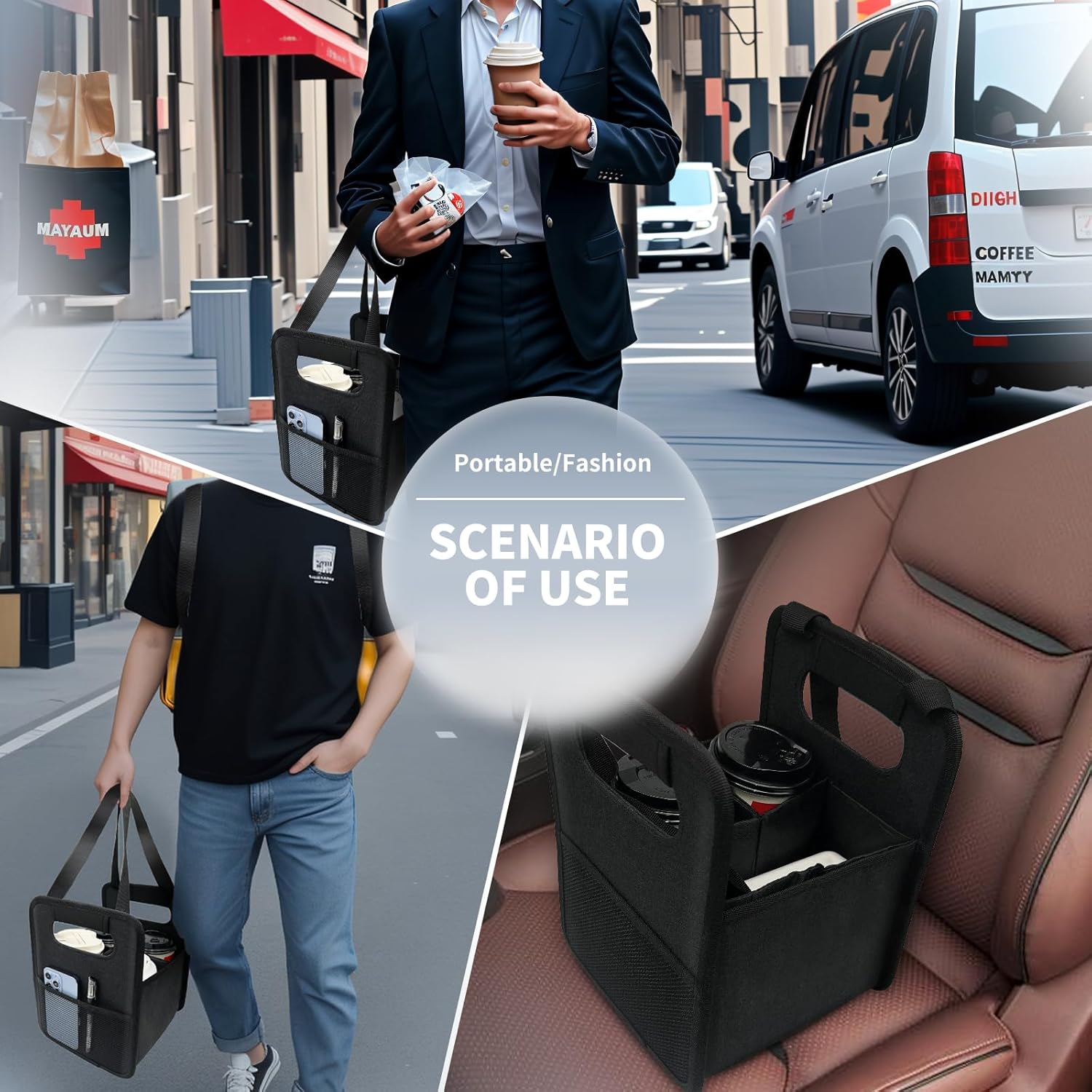 - 【VERSATILITY DESIGN】Our reusable and portable drink cup carriers are a great alternative to disposable cardboard or plastic drink trays. They are designed to help you easily carry beverages of various sizes to any location. Additionally, we offer two different options for picking up the drink cup bag, catering to your specific requirements. The clamshell design enables quick and convenient pickup, making it ideal for food delivery and takeout purposes.