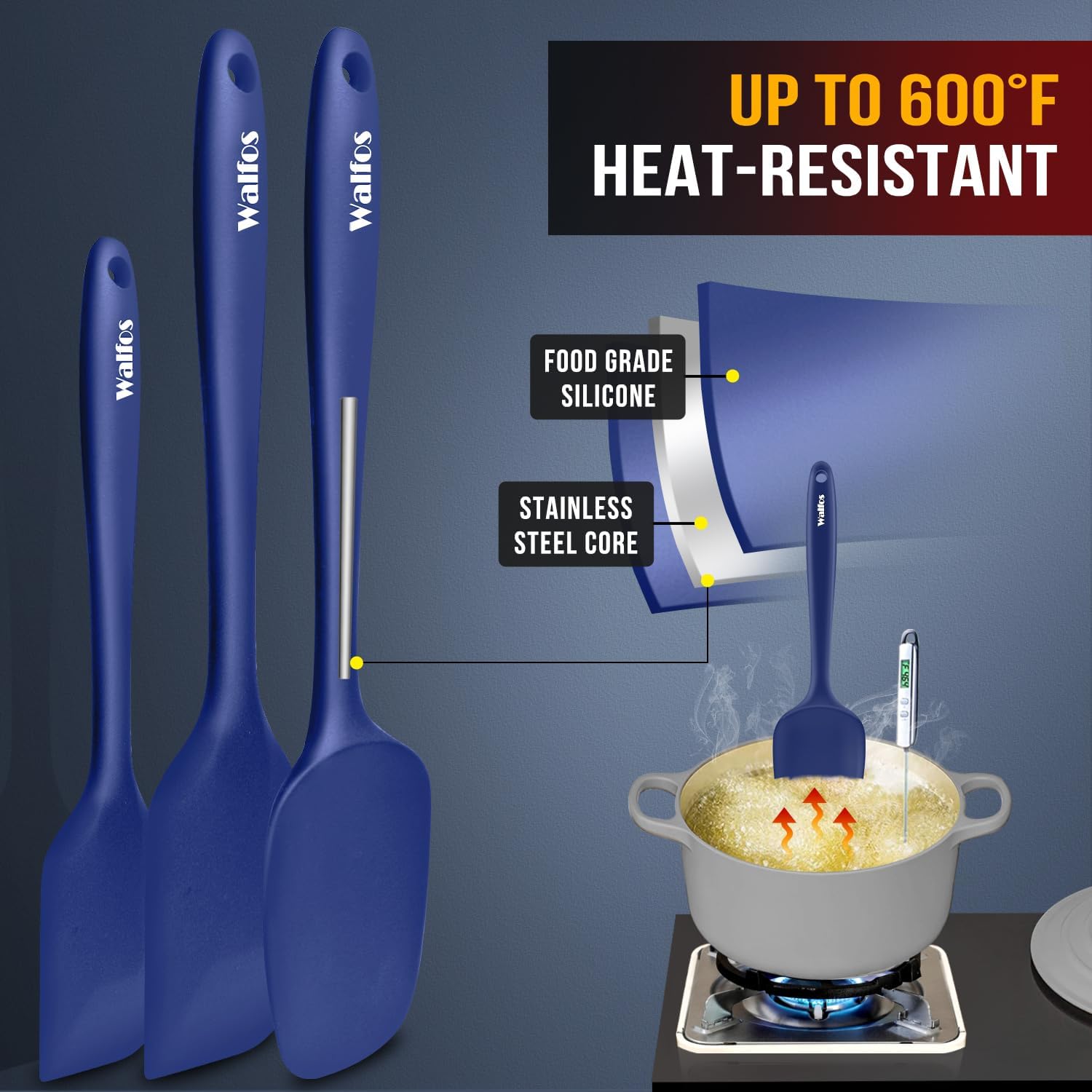 Walfos Silicone Spatula Set (5pcs) - 600℉ High Heat Resistant Kitchen Spoon Navy Blue Spatulas for Cooking Mixing & Baking, Strong Steel Core and One-Pieces Seamless Design, BPA Free Dishwasher Safe