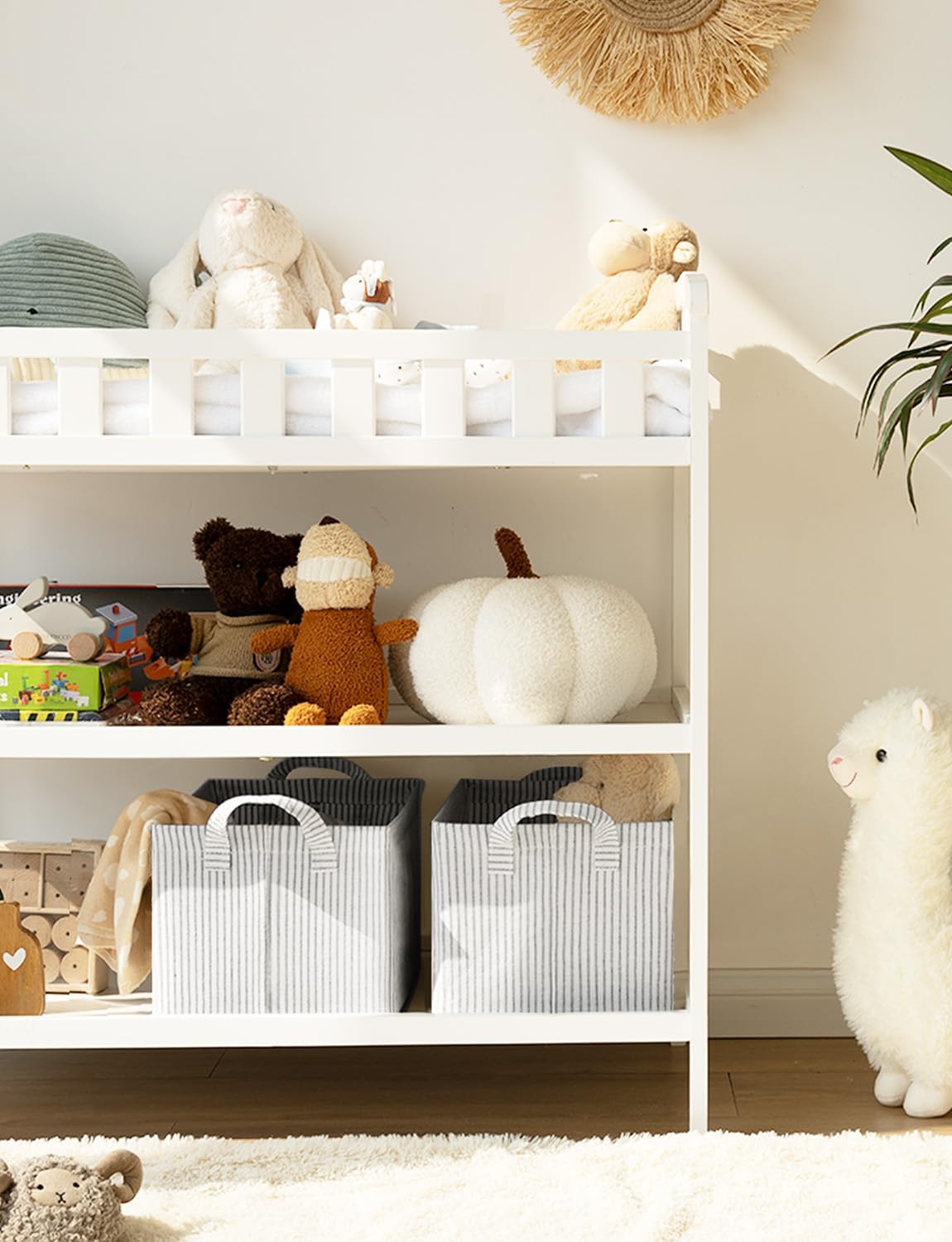 - Premium Quality: Made from high-quality fabric and reinforced with a heavy-duty MDF bottom board and a sturdy metal frame. The solid construction enables the storage bins to stand upright without support, even when empty.