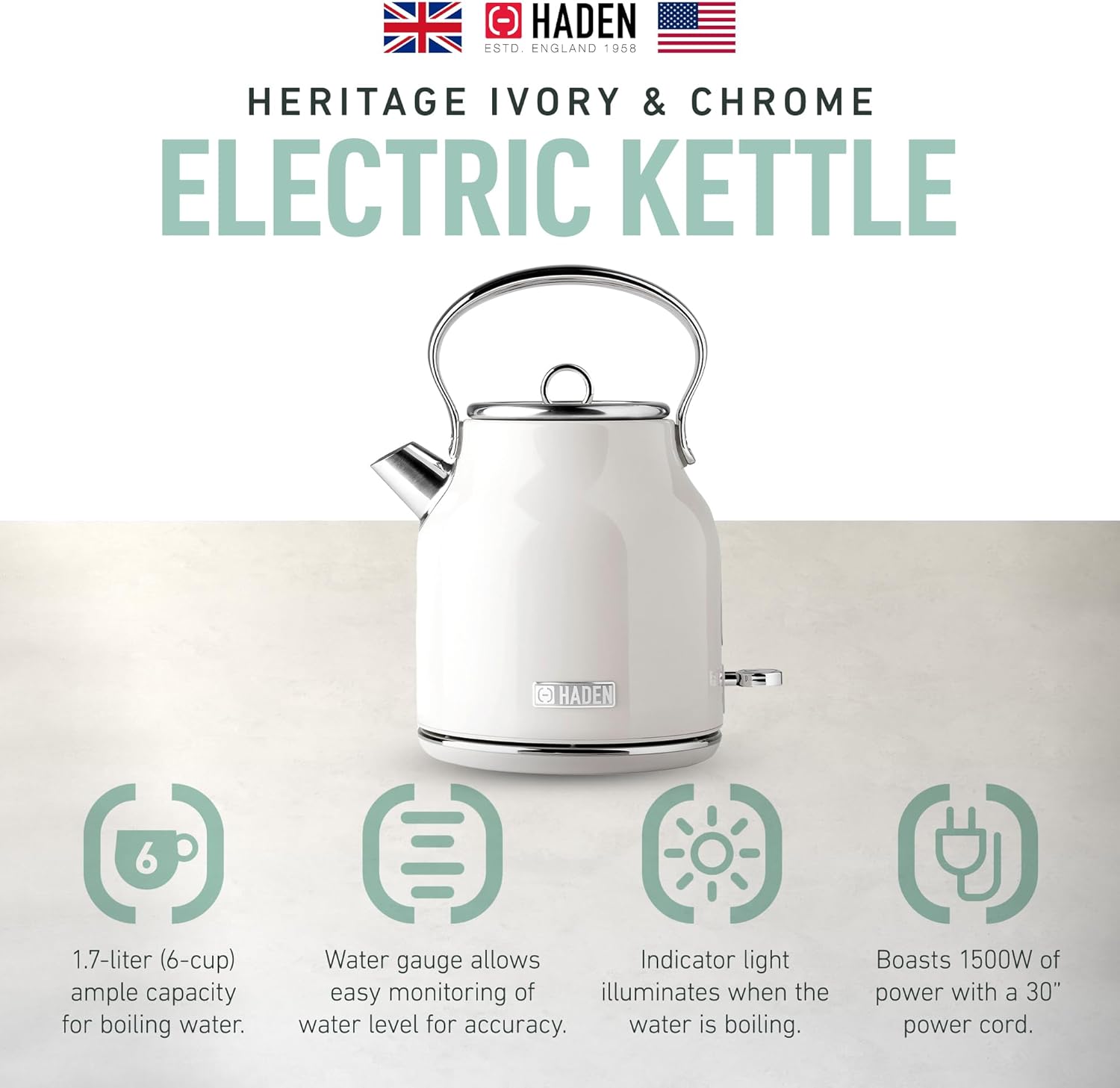 Haden Heritage 1.7 Liter Stainless Steel Electric Kettle, Hot Water Kettle with 360-Degree Base and Auto Shutoff, Ivory & Chrome
