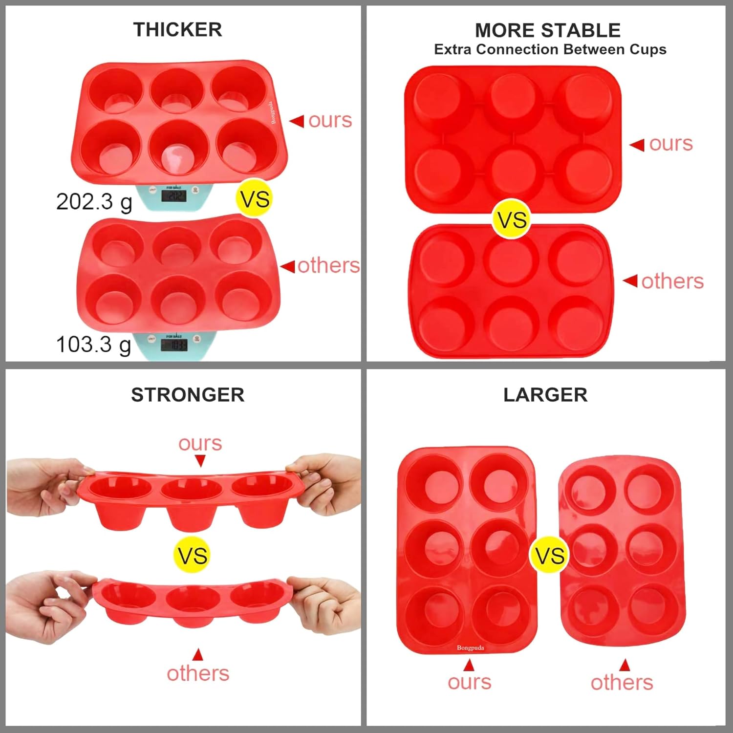 - PREMIUM SILICONE MOLDS FOR MUFFIN & CUPCAKE:Bongpuda silicone cupcake baking molds are made by premium quality silicone material with excellent elasticity,superior high tear strength,and a glossy interior surface;durable cupcake molds able to keep the shape without any deformation;also maintains the flexibility to ensure easy to release your creation project.
