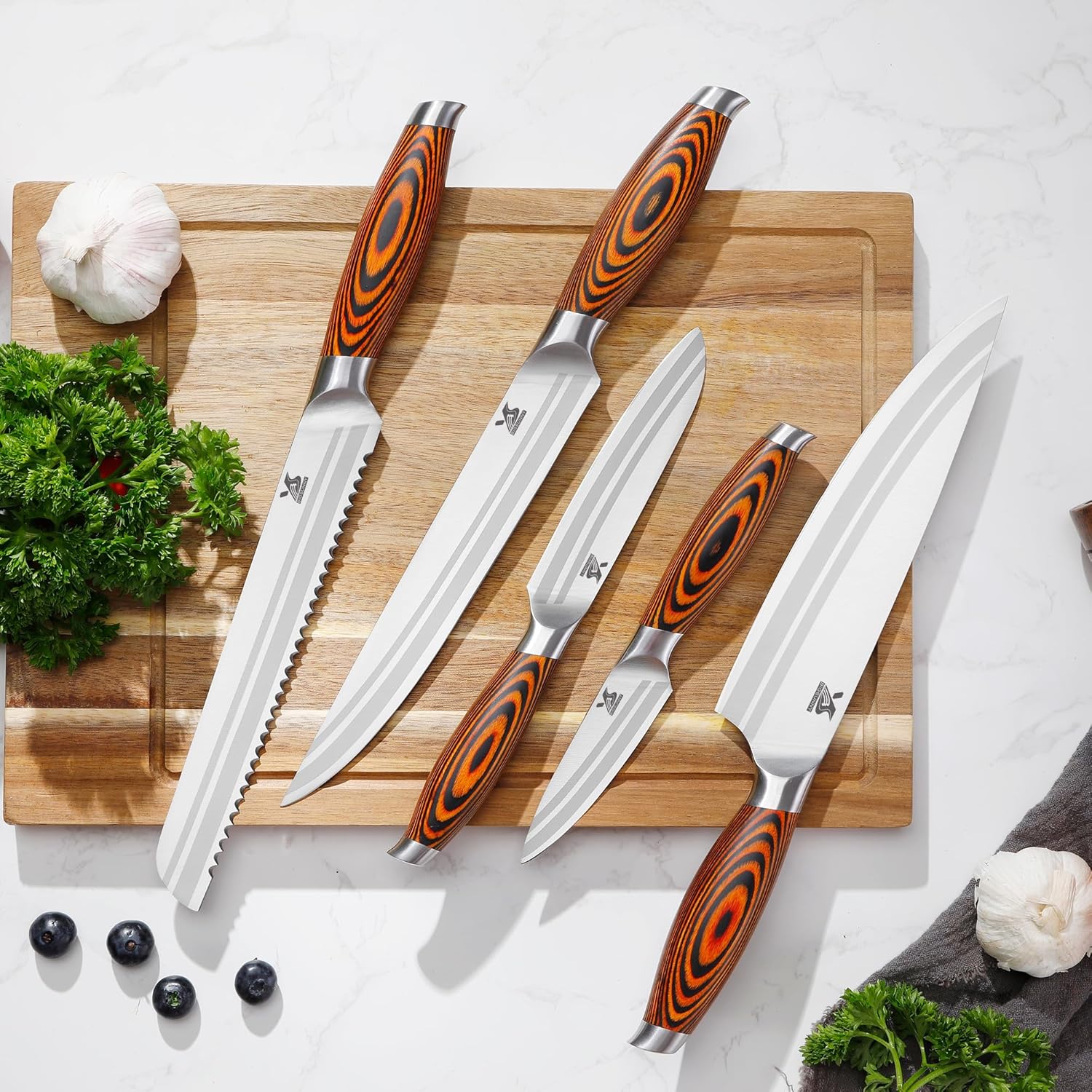 - 【Well-Designed Knife Set】BIGSUNNY Cutlery 5pcs knife set includes: 1*chef knife, 1*carving knife, 1*bread knife, 1*utility knife, 1*paring knife. They are designed to be multipurpose knife for professional homes and restaurants. These blades will provide you with the perfect, clean separation you’ve been searching for slicing, precise peeling, filleting, skinning, trimming and butterflying. It is essential for any serious chef.