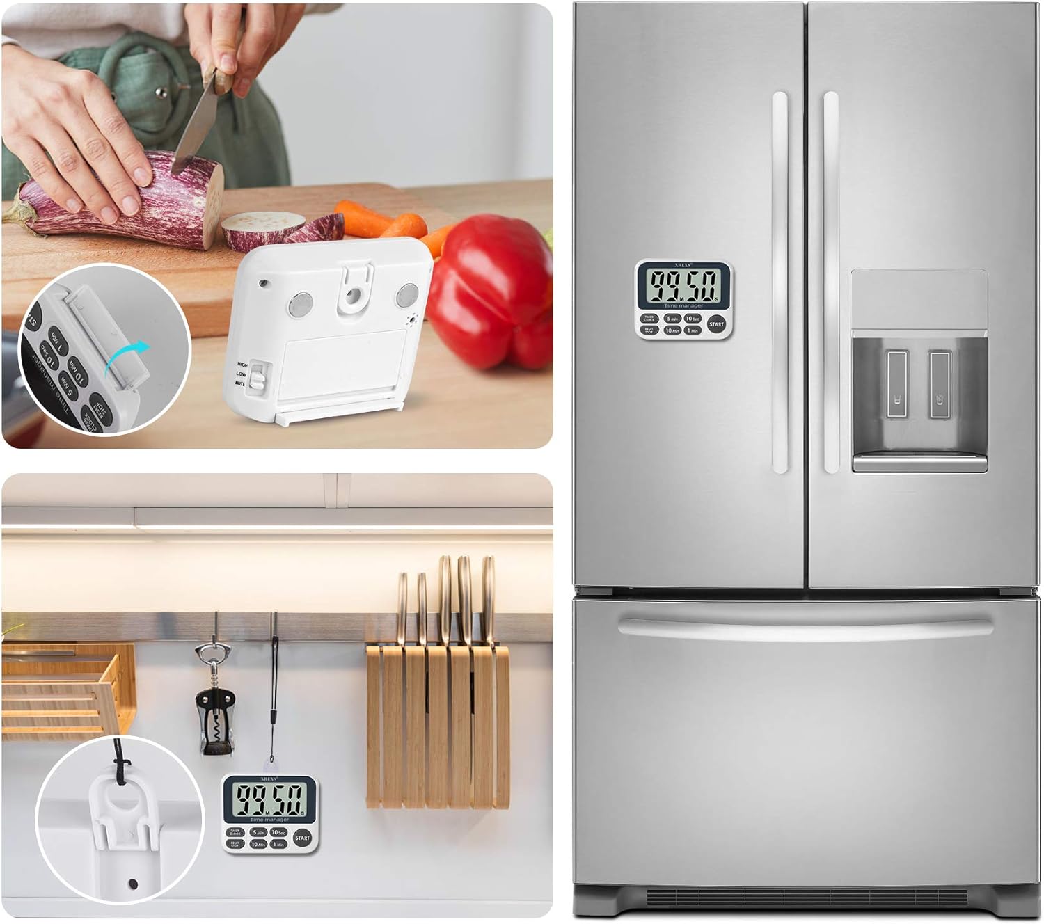 - MAGNETIC BACK, RETRACTABLE STAND AND HOOK FOR HANGING ----- The digital kitchen timer is convenient to place in three ways . Hang on the wall or place on the table. Especially it can stick to the front of the refrigerator with strong magnet.