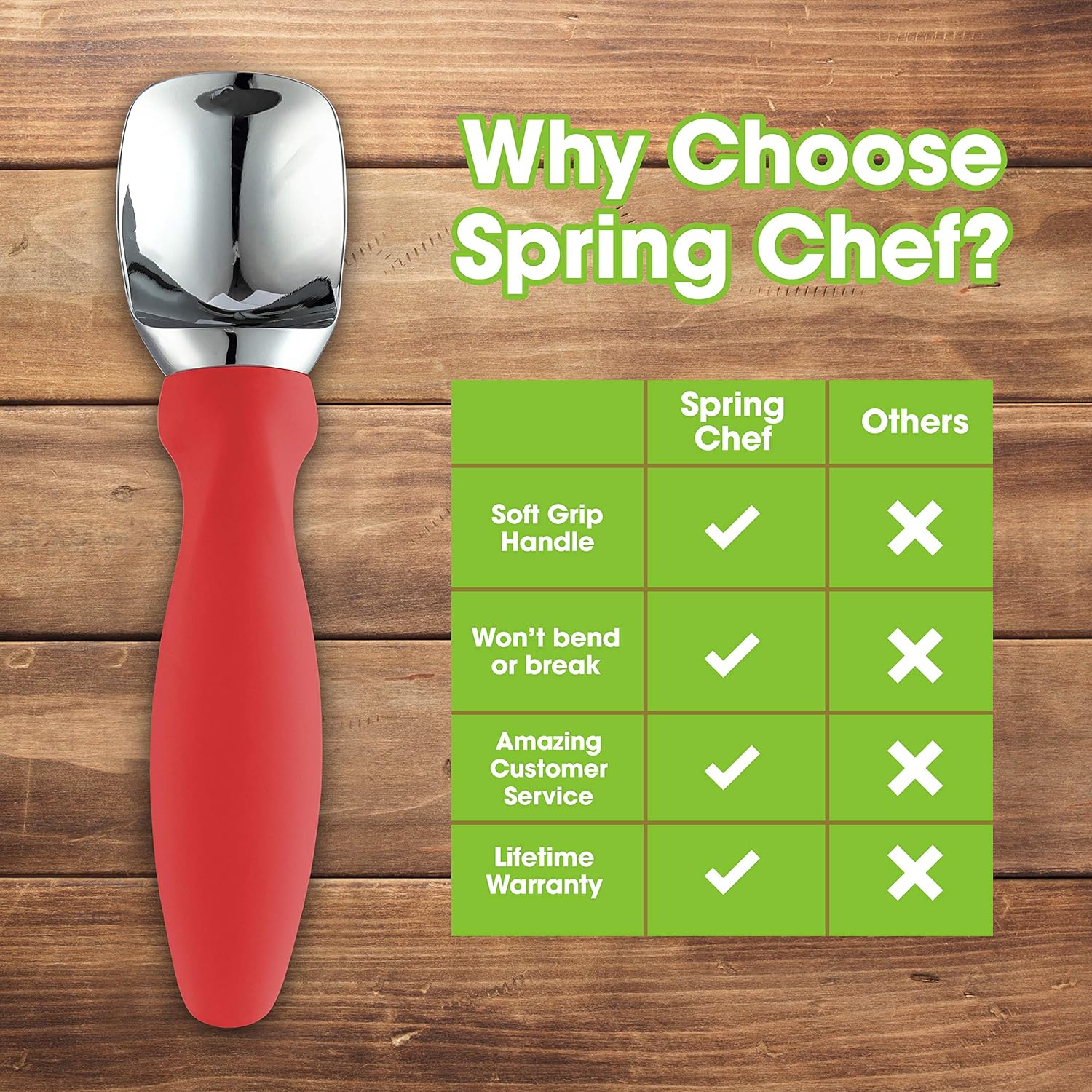 - Why Struggle With A Bad Scoop - With its pleasant weight, ability to get into hard-to-reach parts of a carton and excellent handling of hard ice cream, Spring Chefβs scoop does the heavy lifting. The soft grip handle is comfortable to hold, easy to grip, absorbs pressure and doesn't freeze your hand like scoops with a metal handle can. No antifreeze gimmicks. Simple yet ergonomic design that is easy to clean and will make scooping even easier.