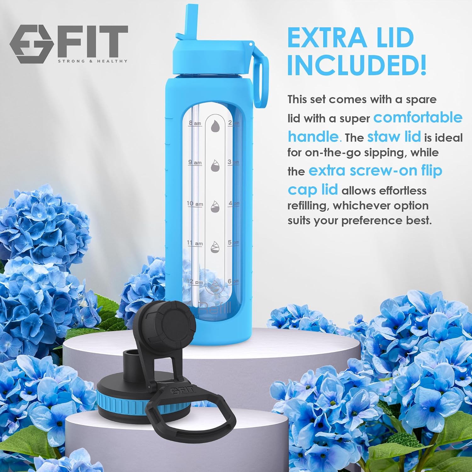 - Water Bottle and Cleaning Brush Set: Upgrade your hydration routine with our 32 oz Glass Water Bottle with Time Marker and Cleaning Brush Set; this version features an extra thick silicone sleeve for extra protection, insulation, and a secure grip; we've also upgraded one of the lids to a straw lid for sipping on the go; the 32-inch Water Bottle Brush is made from durable silicone material, which effectively removes dirt and residue; plus, it does not absorb unpleasant odors and stains