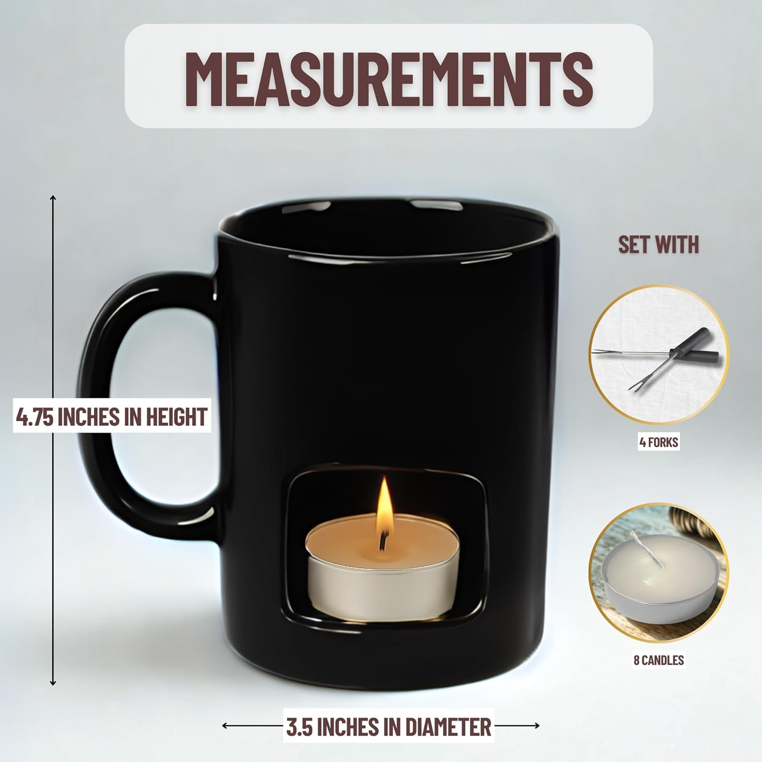 - Durable : Sleek ceramic personal fondue mugs feature a clean, minimalistic shape and are available in your choice of classic white or black to complement any table setting. Nothing to plug in, no large pot to clean. 8 tealight candles are included. They are easily replaced with any tealight for years of use
