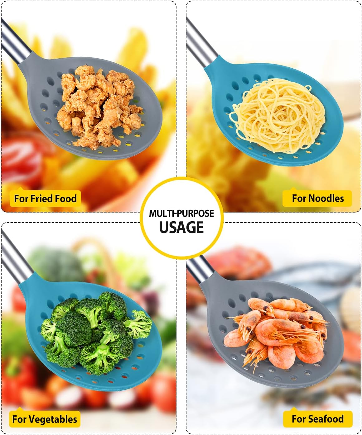 Kitchen Ladle Strainer Set of 2 Large Slotted Spoon with High Heat Resistant BPA Free Non Stick Cooking Skimmers For Draining and Frying (Grey and Teal Blue)
