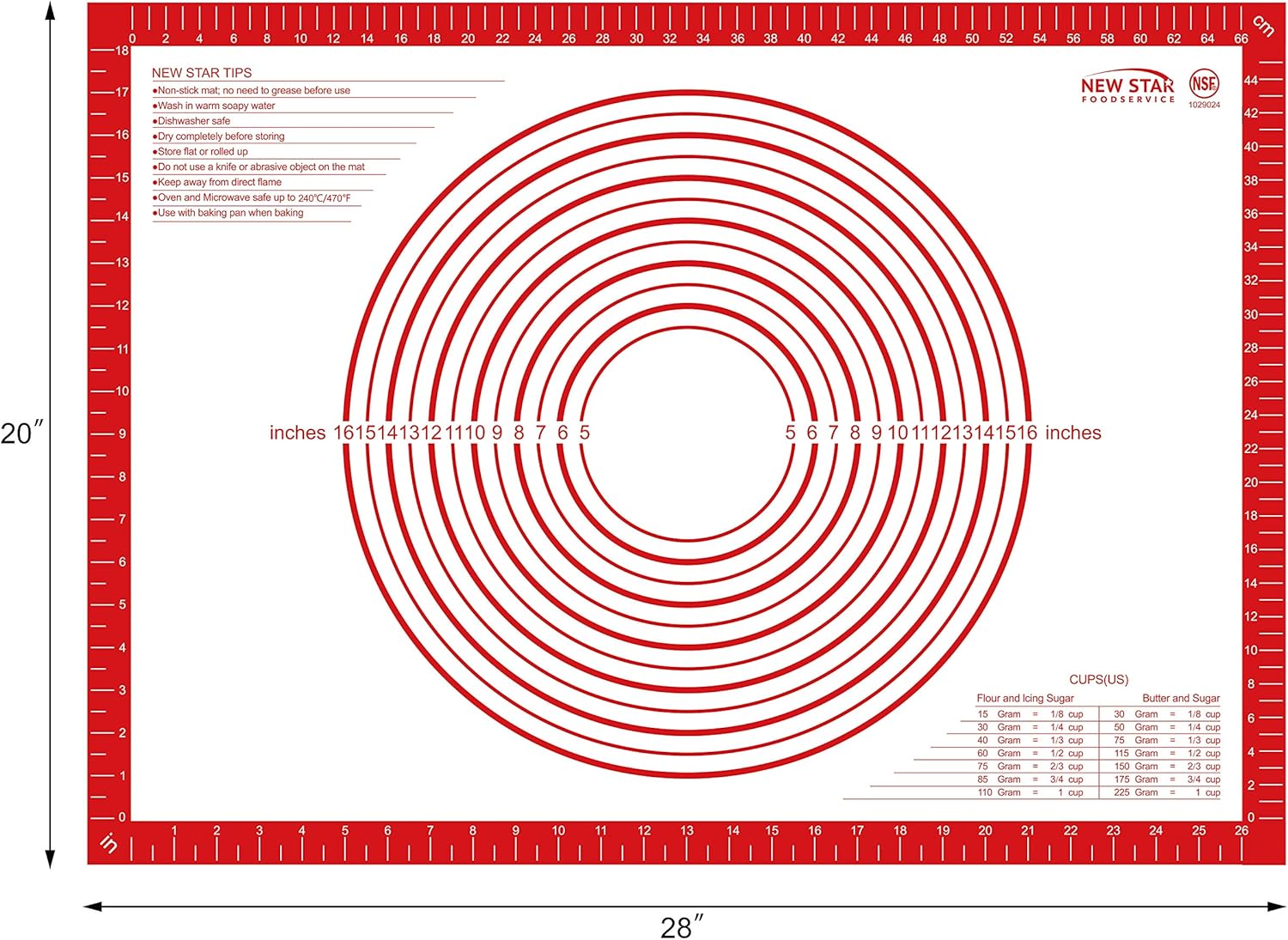New Star 1029024 Non-Slip Silicone Pastry Mat, Extra Large with Measurements, 20x28'', NSF International Certified