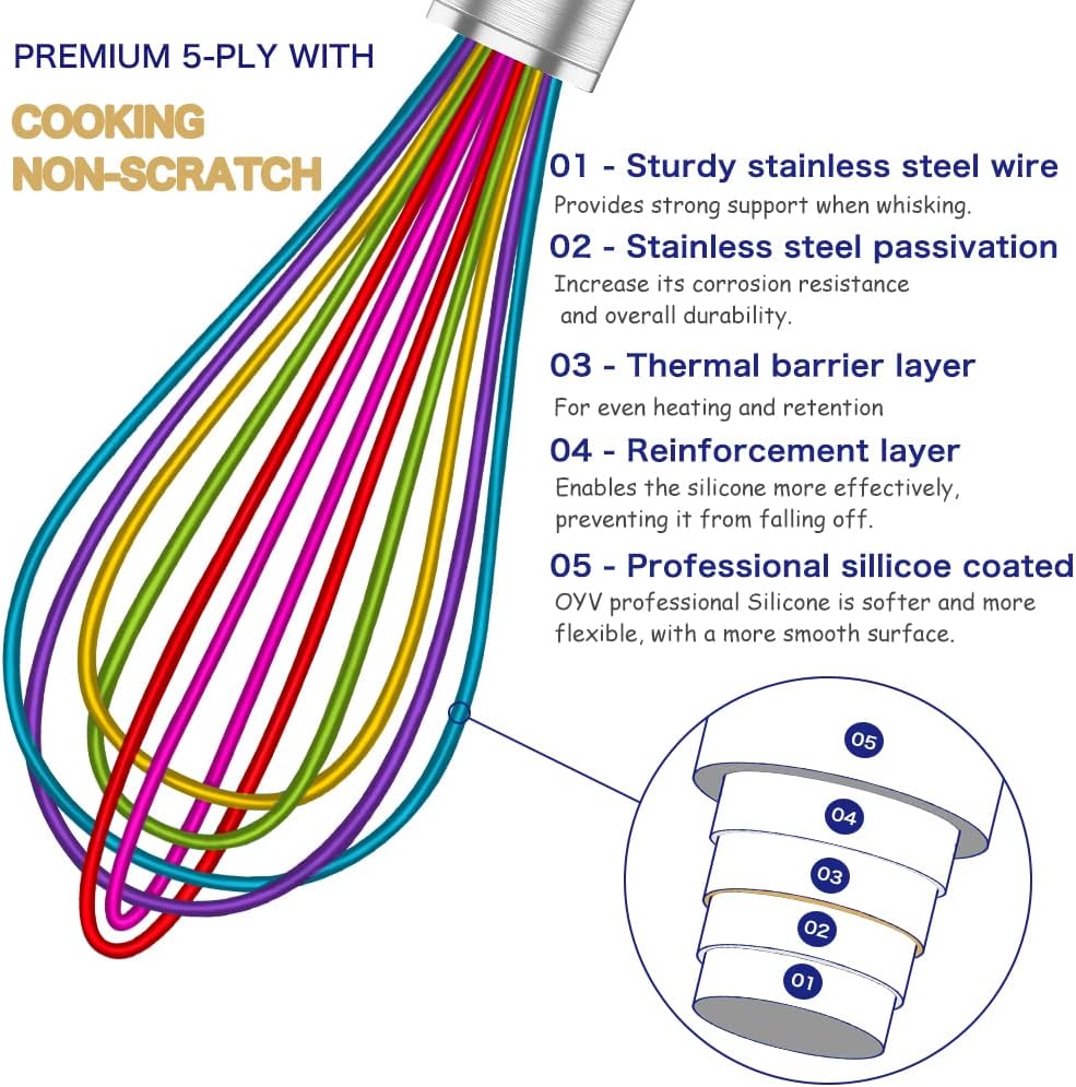 - PROFESSIONAL SILICONE WHISK FOR COOKING NON SCRATCH: Features a 1.75 mm durable stainless steel core coated with 0.4 mm premium silicone. The soft, flexible silicone surface prevents scratching or damaging pots, pans, or bakeware