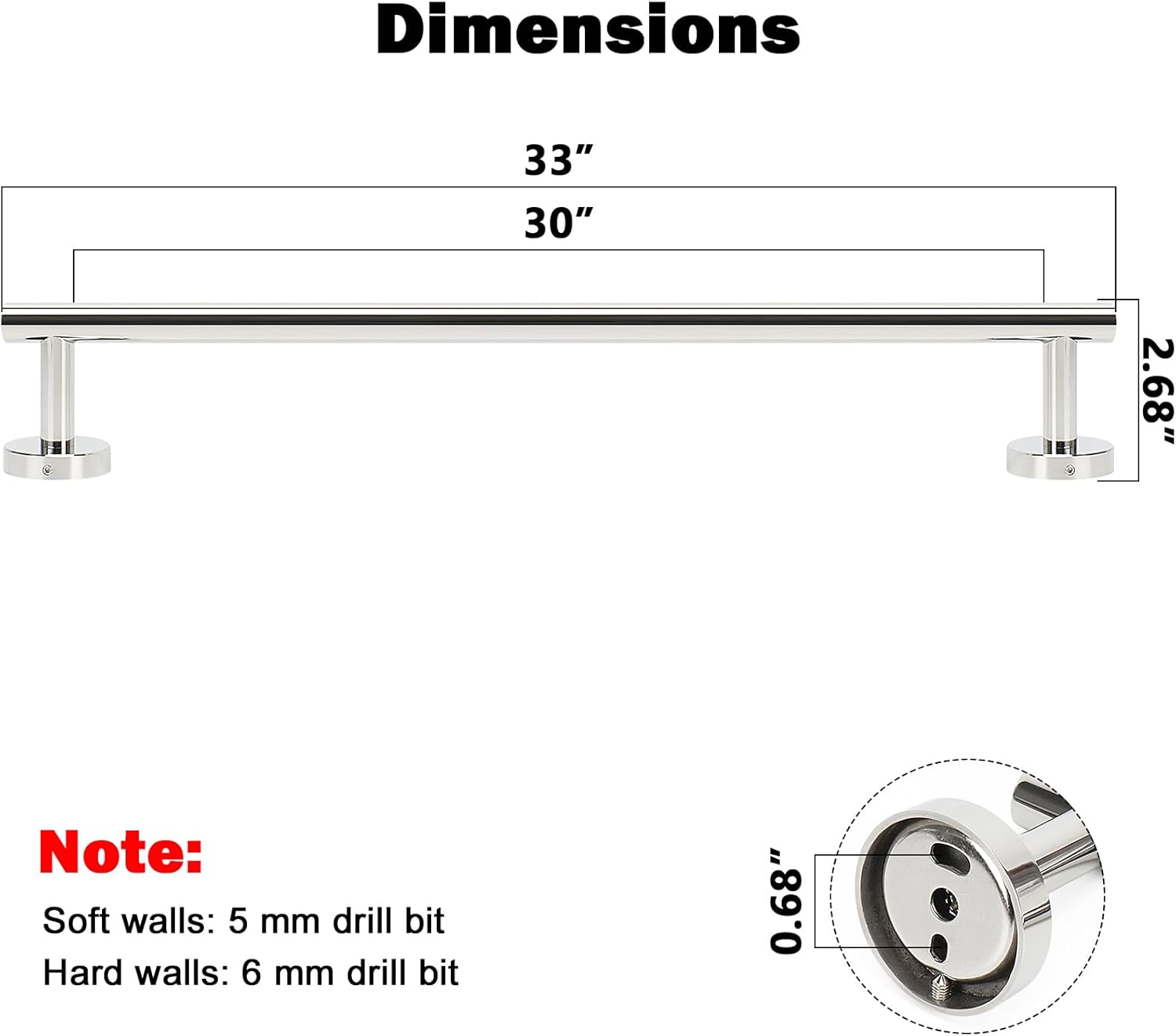 - DIMENSIONS & USE: Overall length is 33" (838mm). The length of hanging space is30" (770mm). 22-Lbs (10kgs) max weight capacity. You can mount this towel bar to either side of your cabinet or closet door for storing at-use hand and dish towels. It can also be used with S hooks, hanging bath balls, hair dryers, tea cups, spoons, clips, etc.