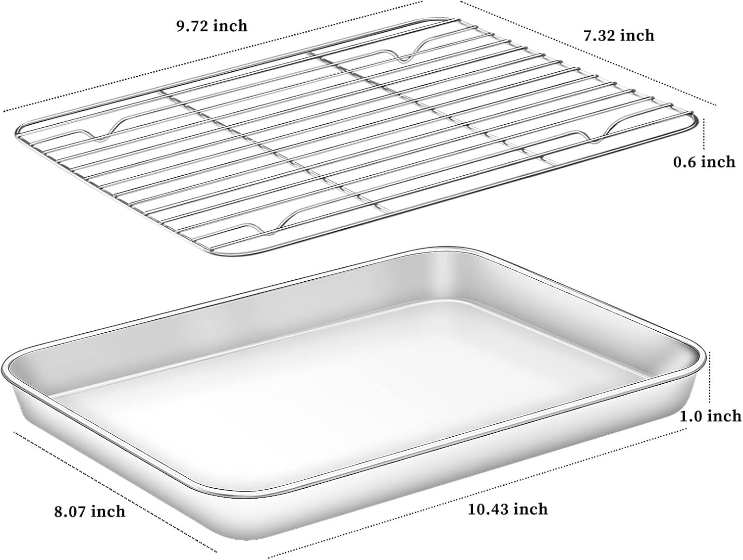 - π¬ [CLASSIC SET FOR BAKING] You will get 4 pieces, including 2 baking sheets - 10.43 x 8.07 x 1 inches and 2 cooling racks - 9.72 x 7.32 x 0.6 inches, apply to regular oven and toaster oven. Sheet pans are used for baking and cooling rack set can be used separately or together since the cooling rack fits perfectly into the half sheet pan.
