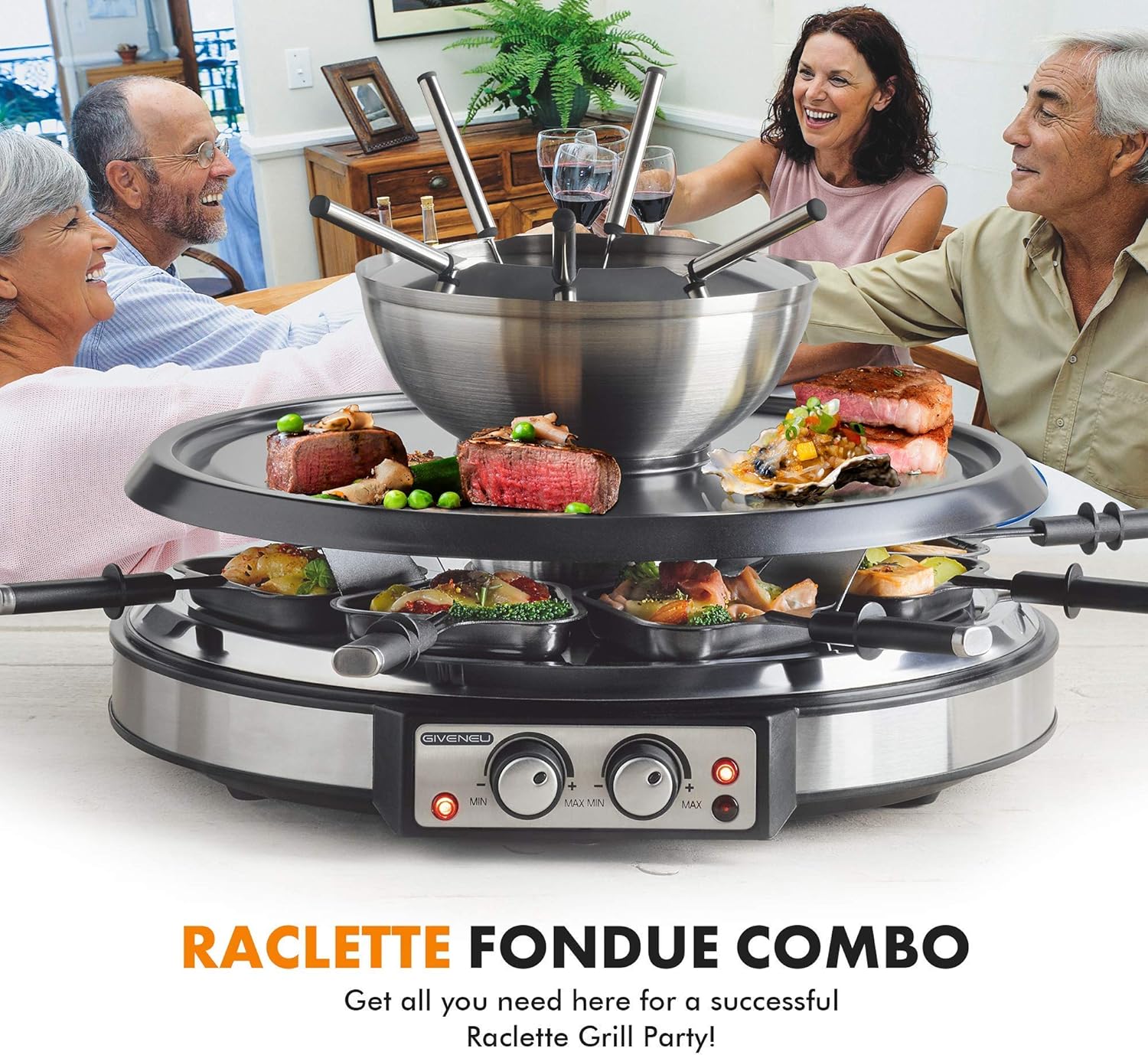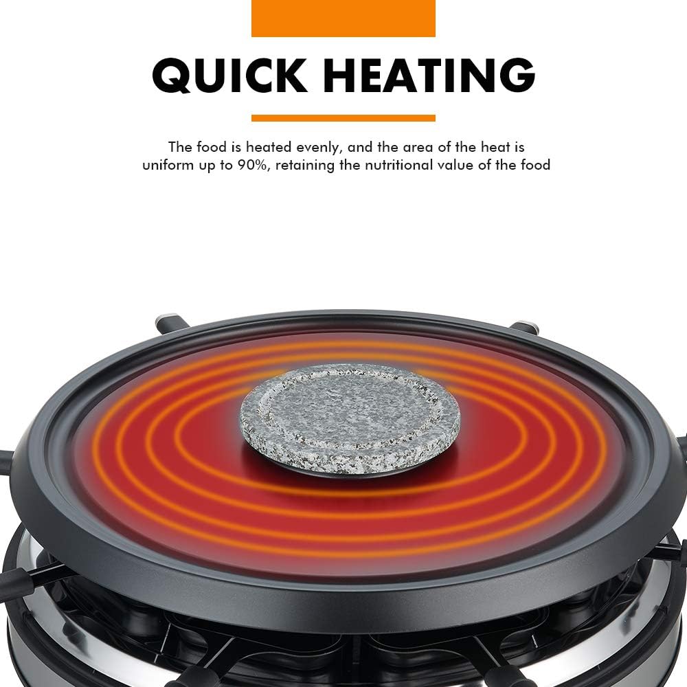 - Raclette Grill+ Fondue Combo - 1.5QT brushed stainless steel fondue pot with round raclette table grill, this combo is deal for family party for 8 people. Make cheeses, chocolates and cooking liquids in the fondue pot and grill meat, seafood, vegetable and more food just in one combo. Get all you need here for a successful Raclette Grill Party!