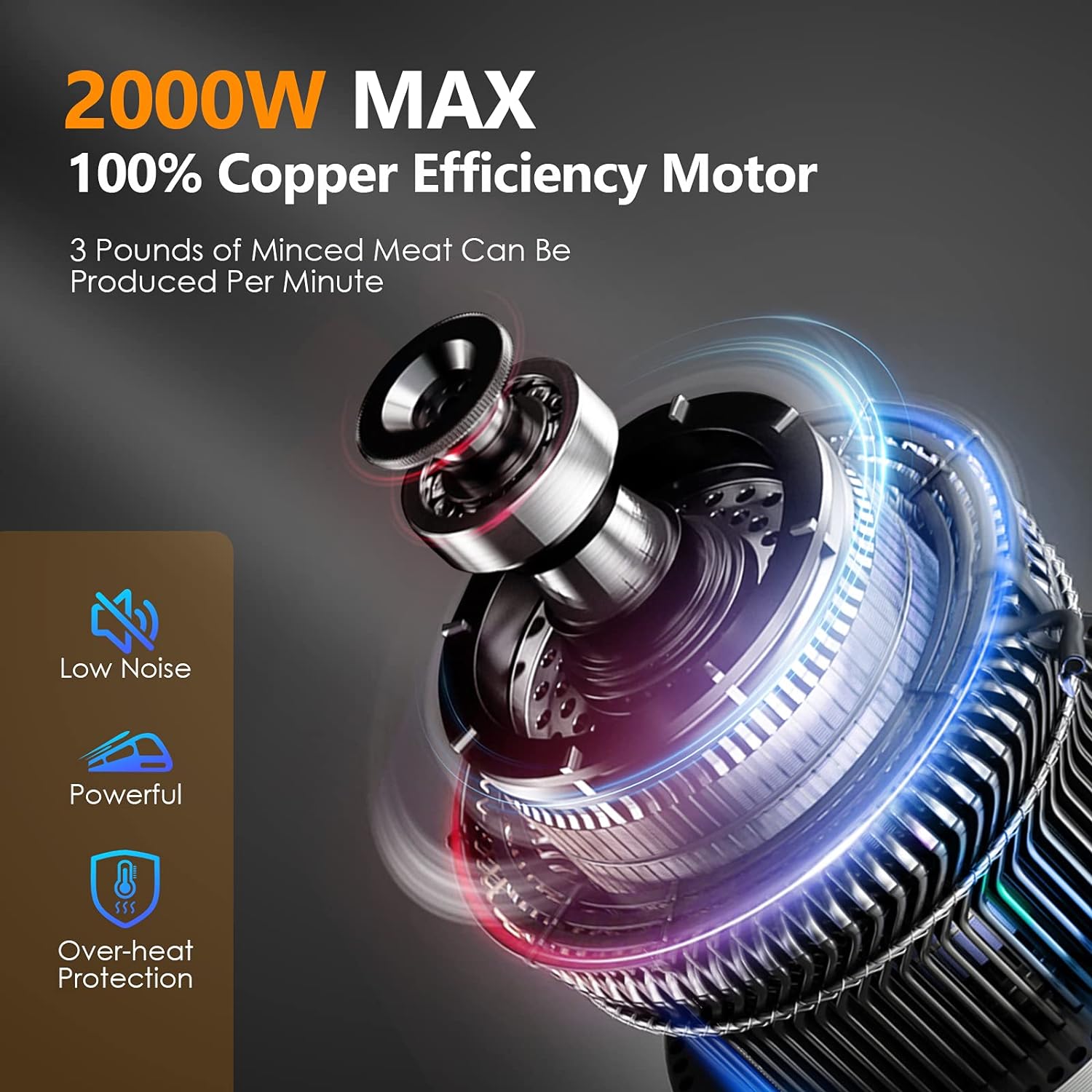 - [Powerful Motor] The meat grinder mechanical is using the 100% pure copper motor normal rated power up to 350W and the peak value can reach up to 2600 watt. Various meats and vegatables can be ground efficiently- opproximately 180 lbs meat/hour, great for saving your time and labor t grind it.