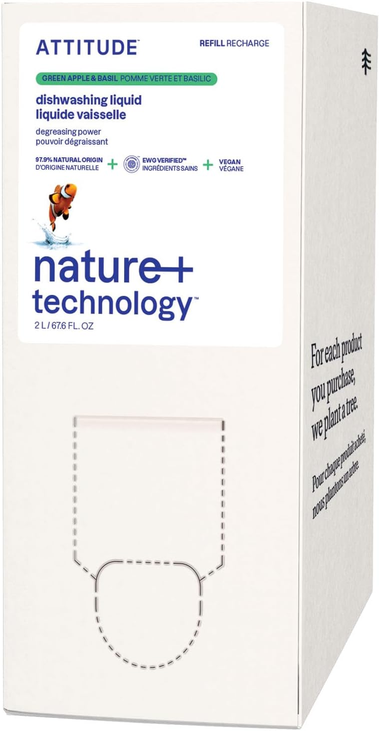 ATTITUDE Dish Soap Refill, EWG Verified, Plant-Based & Vegan Dishwashing Liquid, Naturally Derived, Green Apple & Basil Scent, 67.6 Fl Oz