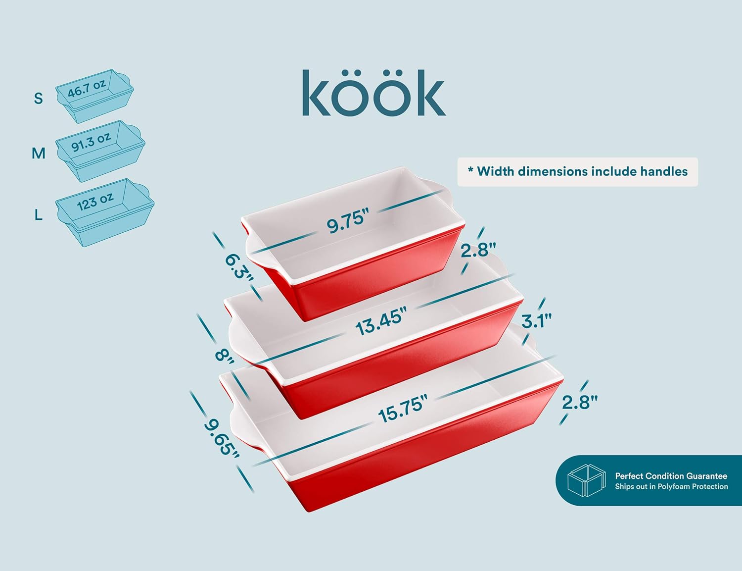 Kook Casserole Dish, Ceramic Baking Dish, Large Lasagna Pan Deep for Oven, 8.5 x 14, 11 x 7, 8 x 5, Set of 3, 92oz, 50oz, 20oz, Baking Pan with Handles, Oven Safe and Durable, Home, Gift, (Cherry Red)