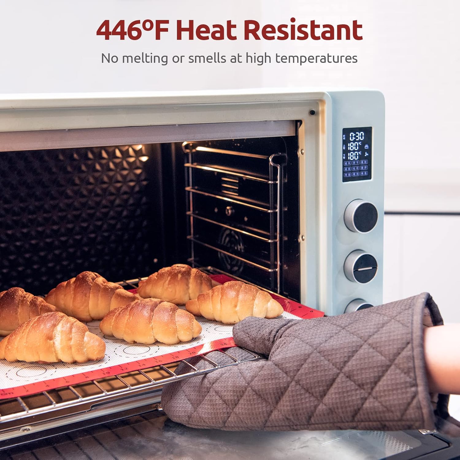 - [446ºF heat resistant feature] We use the food grade liquid silicone (the same material as baby nipple) to wrap fiberglass, which is more heat resistant and won't melt in your oven. Also no smells or smoke, meeting 9.83% buyers' needs. The inner fiberglass weave insures even heat distribution. Whether you are roasting veggies or making cookies, uneven doneness is no concern. You don't need to worry that your cookies burned on half of the bottom of them while not completely baked on top.