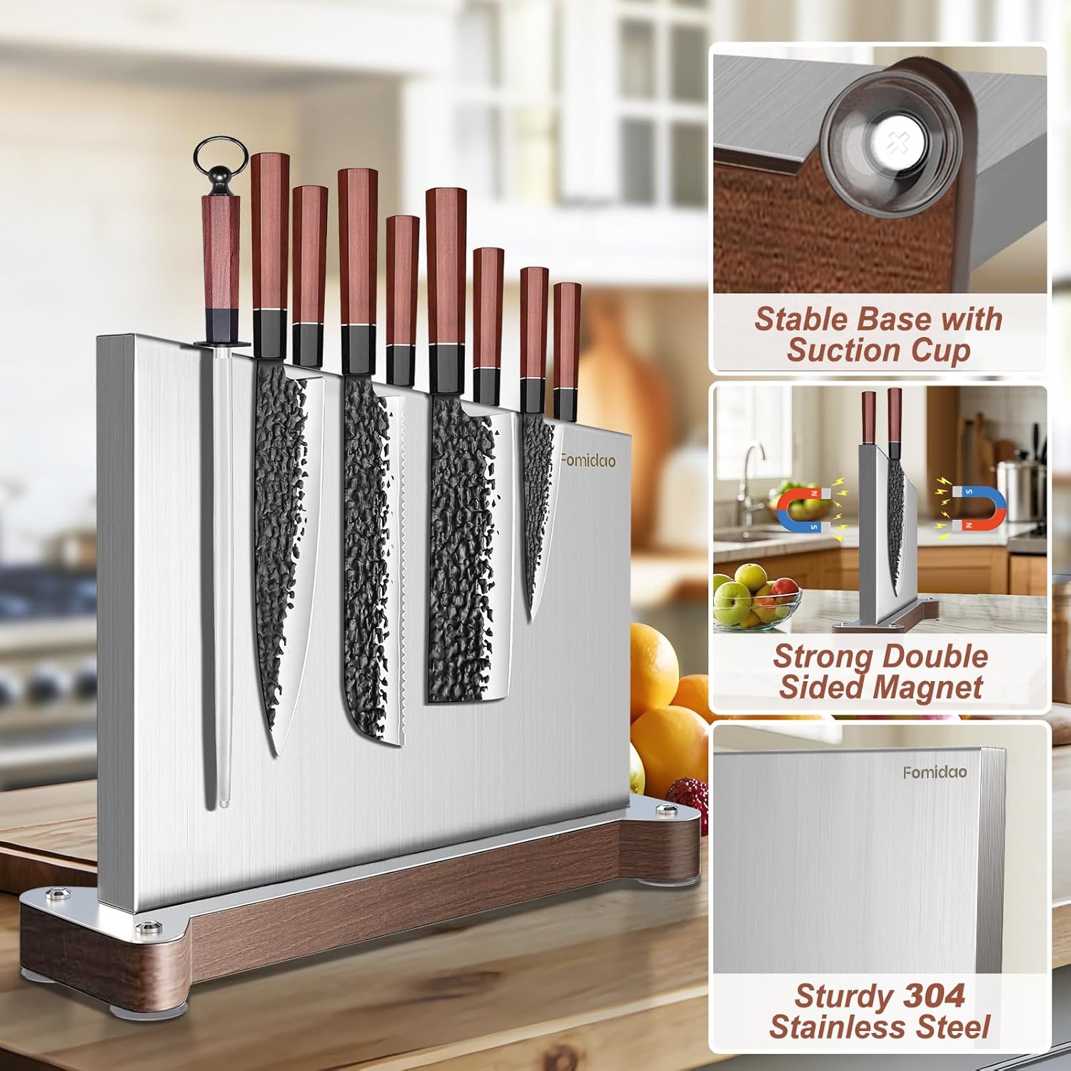 - Premium Material and Craftsmanship:Each base of knife holder is made of meticulously crafted with high-quality wood, naturally grown,comes with the unique natural grain.Knife block magnetic board made of stainless steel and use of brushed technology,not easily scratched,smooth surface will not harm knives,is a must-have in every kitchen or craftsman's workspace.