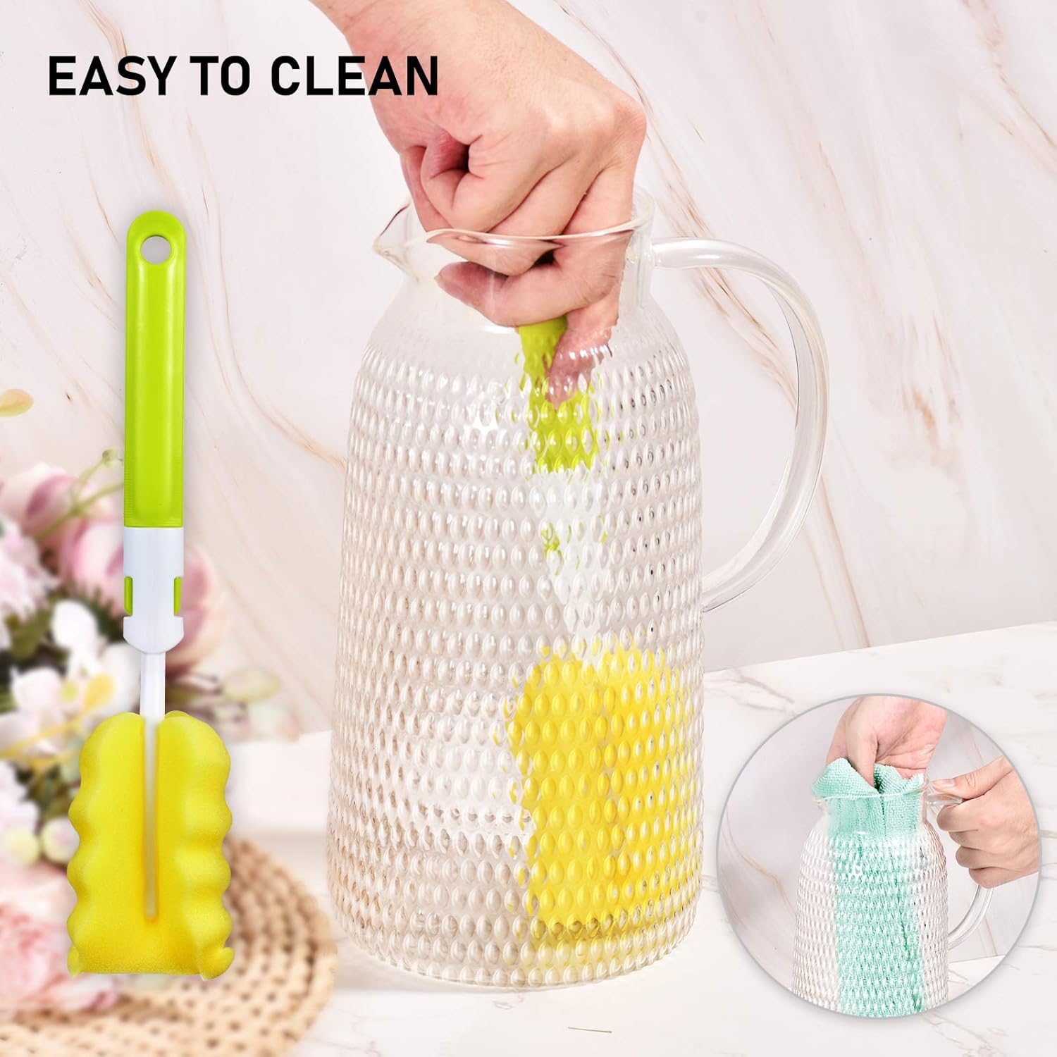 - EASY TO FILL AND CLEAN - You may want to add cut fruit or lemons to your tea or make a fruit infusion. The throat of our carafe is wide enough to allow you can easily add your drinks and fruits inside. The glass pitcherโs wide mouth also makes for easier clean-ups. You can match the sponge brush to clean the glass pitcher.