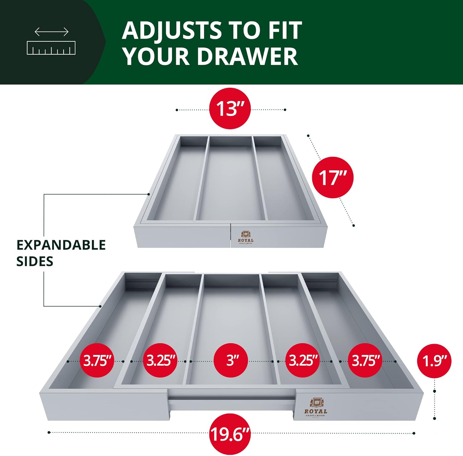 - π πππππππ ππππ ππππππ πππ πππ ππππππππ: Please be aware that the Royal Craft Wood Silverware Organizer is a bit deeper and larger than some kitchen drawers. We kindly ask that you MEASURE your home drawer prior to purchase to ensure that this product is a good fit. Please ensure that your drawer space intended to be used with the drawer organizer is LARGER than 20x18β wide for a guaranteed, comfortable fit when fully expanded