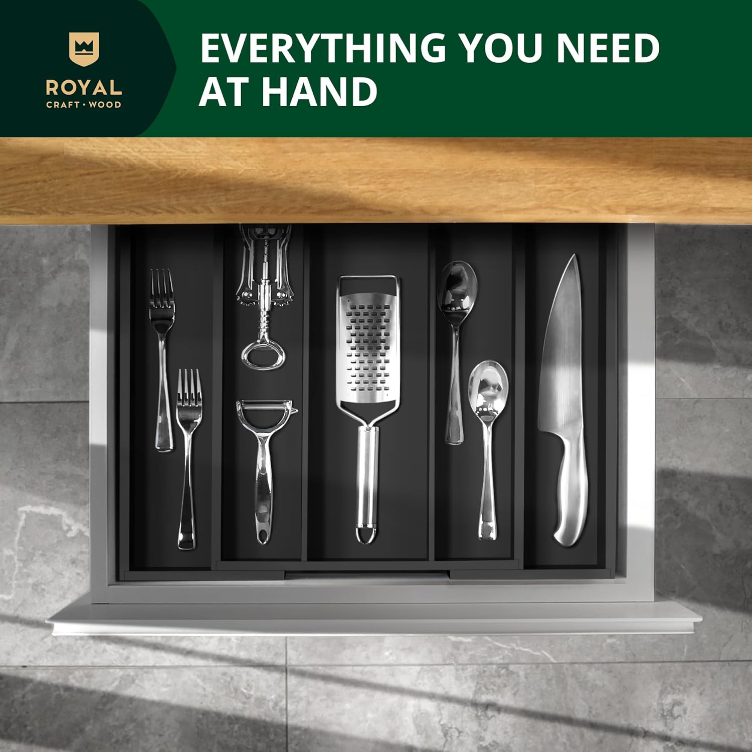 - ๐๐ด๐ฌ๐จ๐บ๐ผ๐น๐ฌ ๐๐ถ๐ผ๐น ๐ซ๐น๐จ๐พ๐ฌ๐น ๐ฉ๐ฌ๐ญ๐ถ๐น๐ฌ ๐ท๐ผ๐น๐ช๐ฏ๐จ๐บ๐ฌ: Please be aware that the Royal Craft Wood Silverware Organizer is a bit deeper and larger than some kitchen drawers. We kindly ask that you MEASURE your home drawer prior to purchase to ensure that this product is a good fit. Please ensure that your drawer space intended to be used with the drawer organizer is LARGER than 20x18โ wide for a guaranteed, comfortable fit when fully expanded