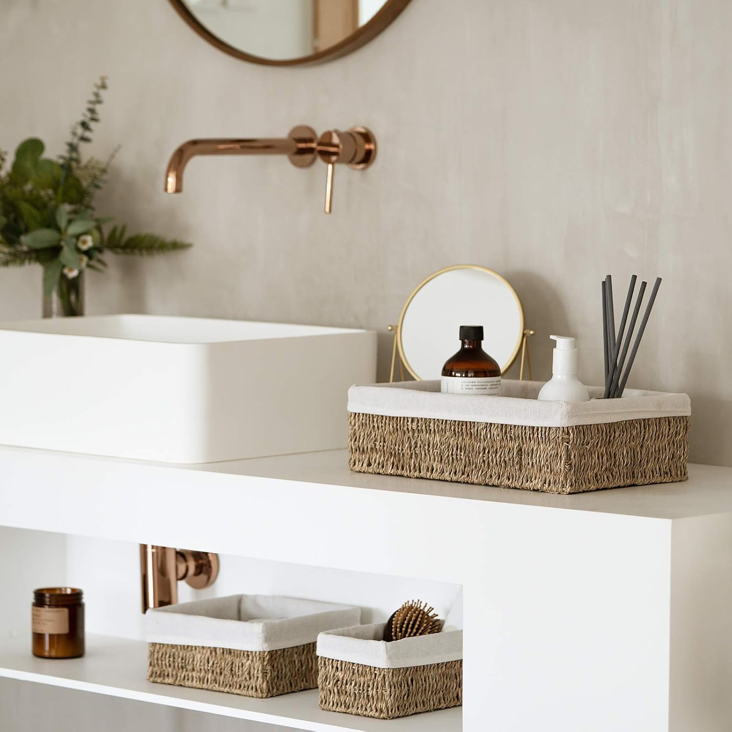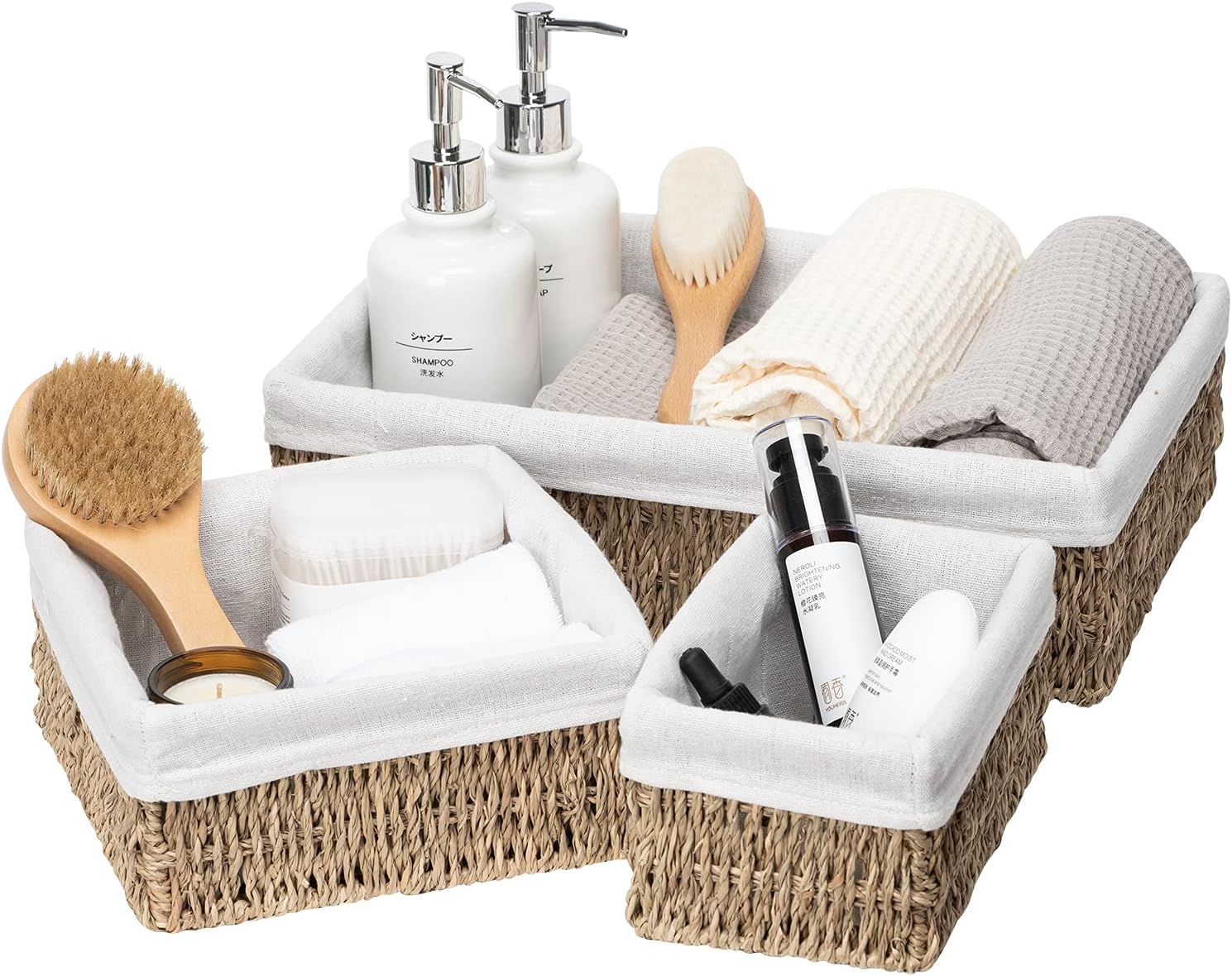 - Versatile: Seagrass baskets with liner linen, which is removable & washable, ideal for clothes, books, magazines, toilet papers, towels, makeups, fruits, snacks, gifts, baby toys, pet toys storage. These small baskets for organizing can be used for drawers, desk, bathroom, pantry, kitchen, toilet, living room, bedroom, nursery room, dorm, classroom, office and more, for both indoor and outdoor use.