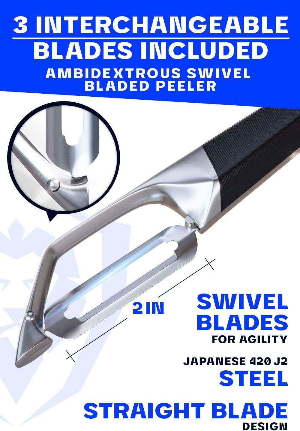 - 3 Blades For Versatility: The Dalstrong Razor VX-I Peeler comes with three Japanese stainless steel blades for every task: fine, serrated, and julienne. Create precise veggie strips with ease, gently cut into the skin of softer vegetables and fruits, or carry out traditional peeler tasks with added precision, such as peeling hard fruits and vegetables, crafting beautiful garnishes, and more.