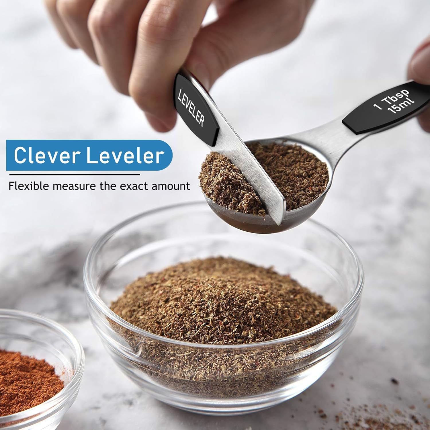 - DUAL SIDED SPOONS: The rectangular end of 8 magnetic measuring spoons is narrow to fit into most spice jars, so you won't need to shake spices onto the spoon and you will save more and waste less of your expensive spices. The rounded end is ideal for liquids. The leveler can flexible measure the exact mount. Save precious time too since they are dishwasher safe