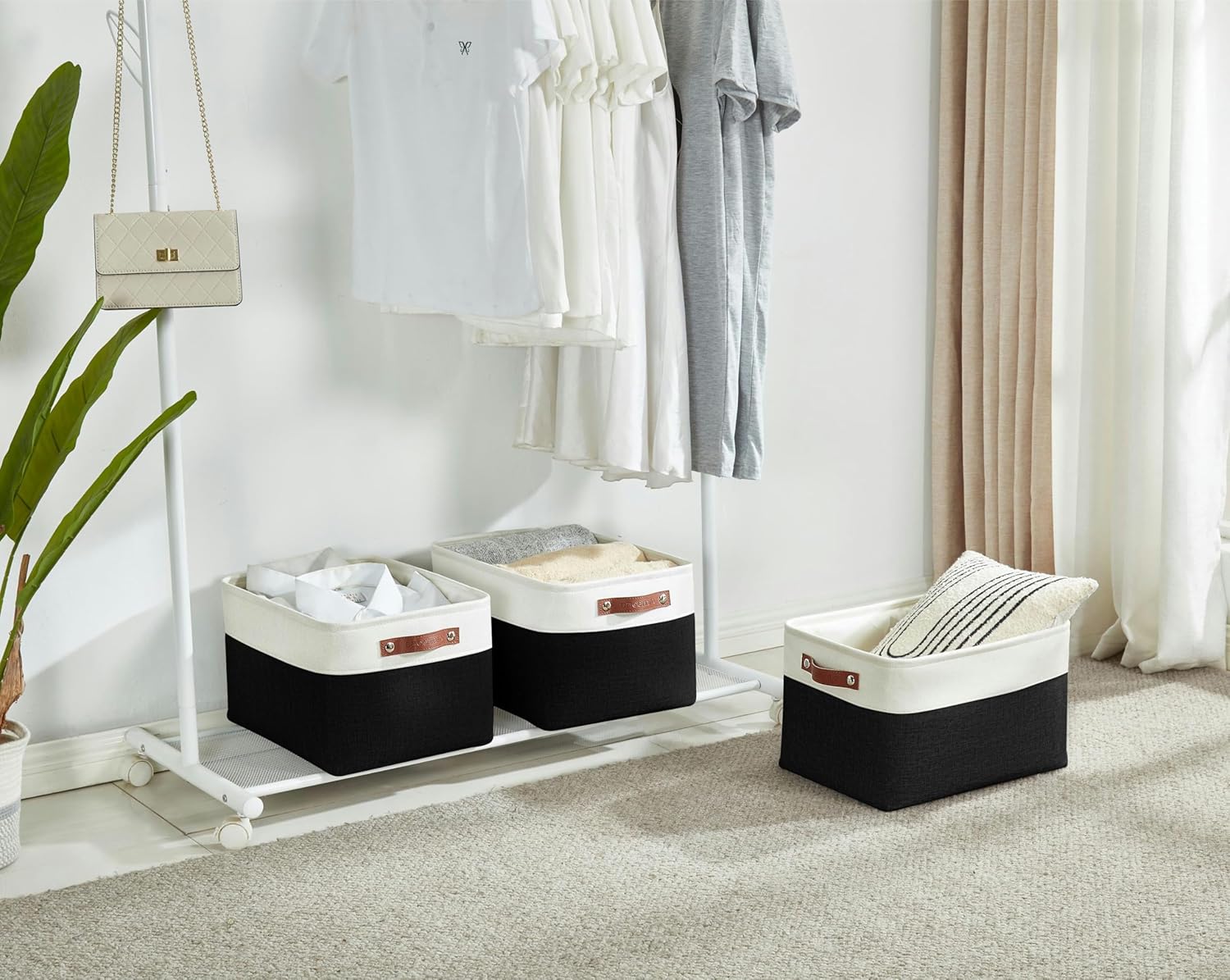 • Sturdy Construction: DECOMOMO closet storage bins are reinforced with upper metal frame and 2.5mm MDF fiberboard bottom to keep the baskets upright. Comes with dual faux leather handles with the weight bearing capacity of 25 lbs.