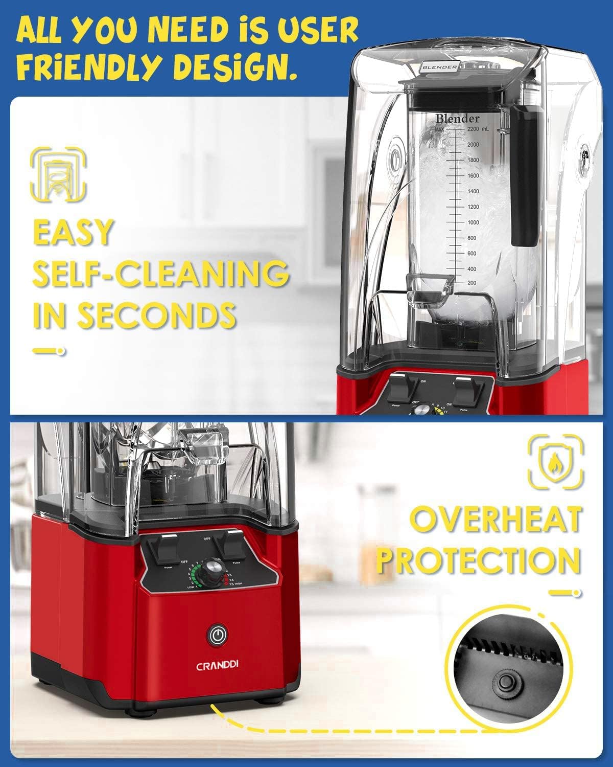 CRANDDI Quiet Commercial Blender with Soundproof Shield, 2200 Watt Professional Blenders for Kitchen with 80oz Pitcher and Self-Cleaning, High-Speed Blenders K90 Red