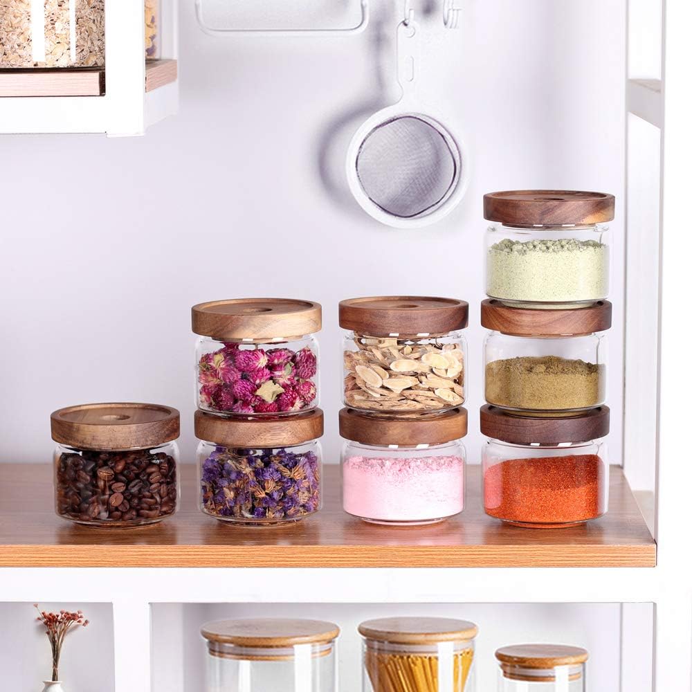 - 【STURDY】These cute spice organizer containers are thicker than other canisters.There is a silicone ring on the acacia lid that will not make a sound and scratch the jars when the bamboo lid is opened.I think the acacia lid is more environmentally friendly and healthy.