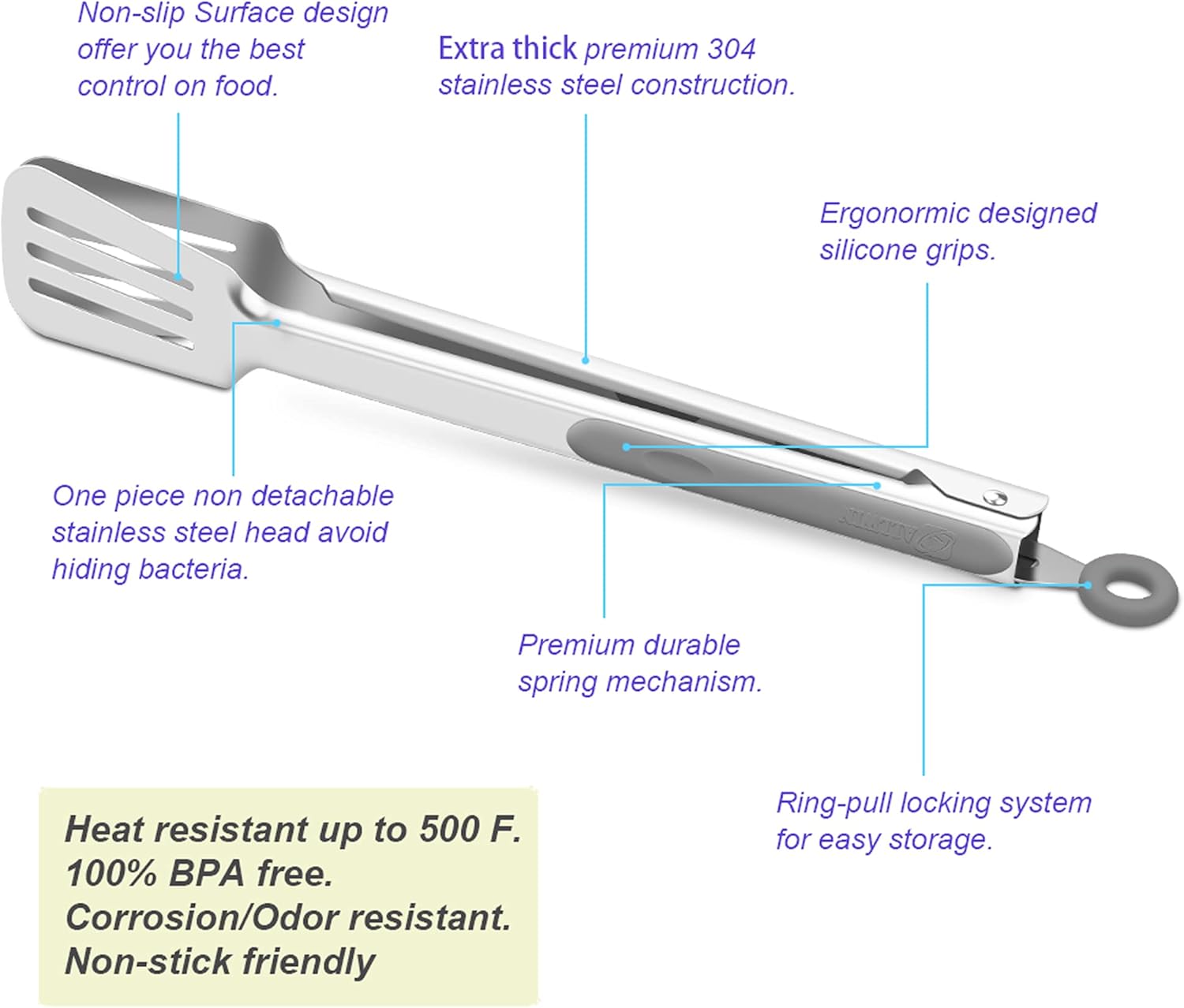 Premium 304 Stainless Steel Barbecue Turners, Heavy Duty Non-Stick BBQ Cooking Kitchen Tongs, 9" and 12" Grey
