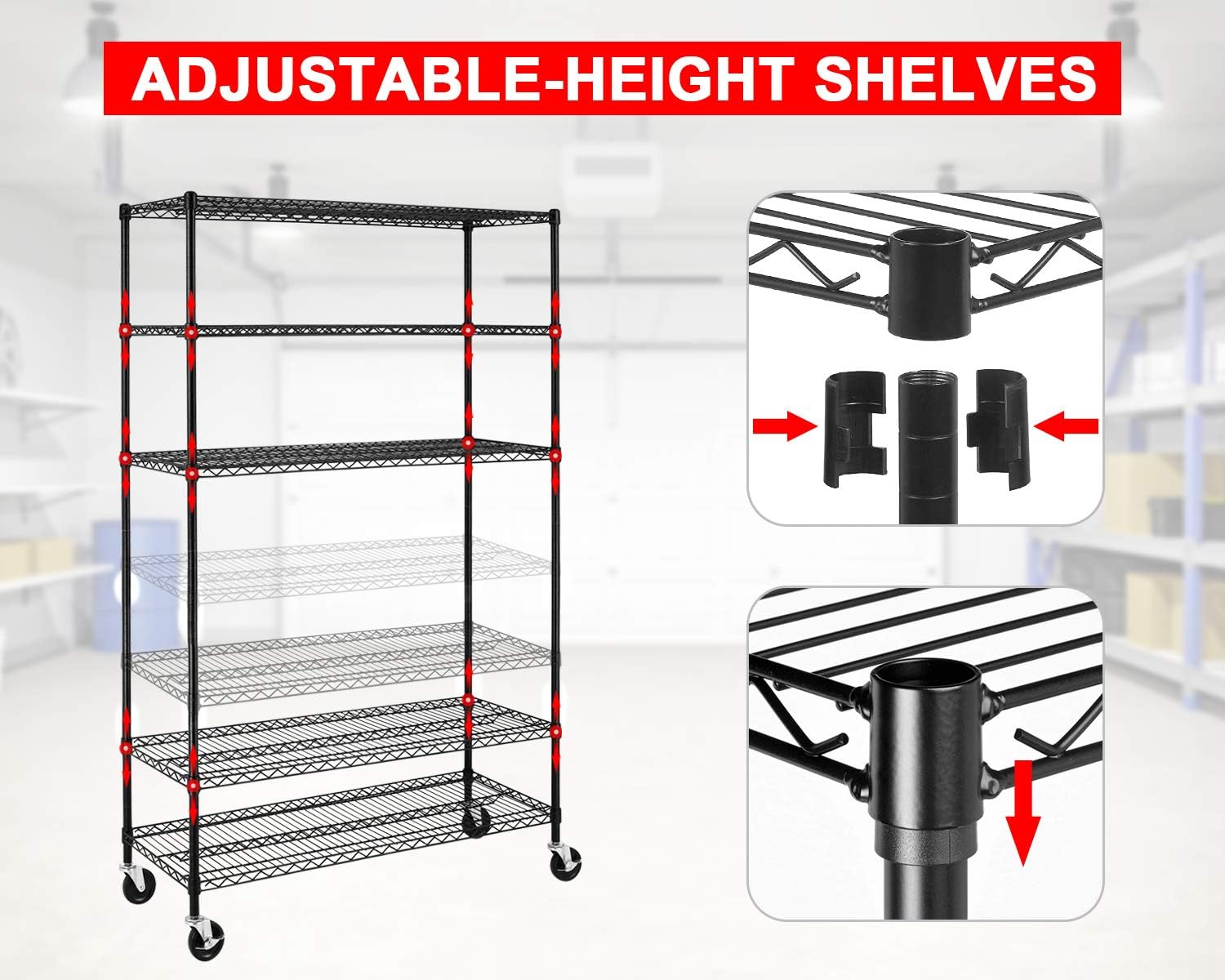FDW 48" L×18" W×76" H Wire Shelving Unit Metal Shelf with 6 Tier Casters Adjustable Layer Rack Strong Steel for Restaurant Garage Pantry Kitchen Garage,Black