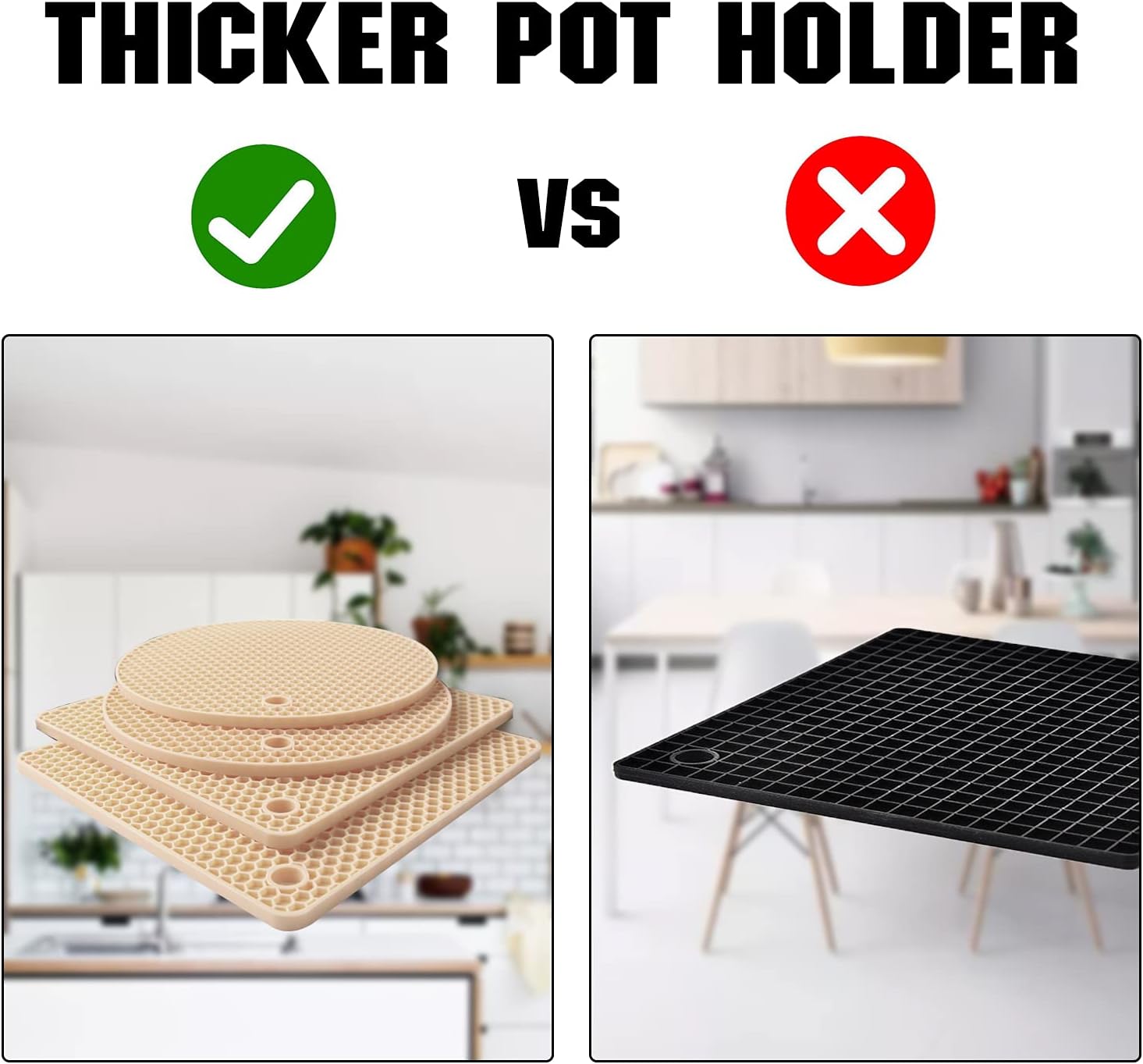 - FLEXIBLE AND DURABLE SILICONE TRIVETS: Our pot holder sets are thicker than traditional sets to provide long-lasting durability and better protection for your countertops while maintaining their flexibility.
