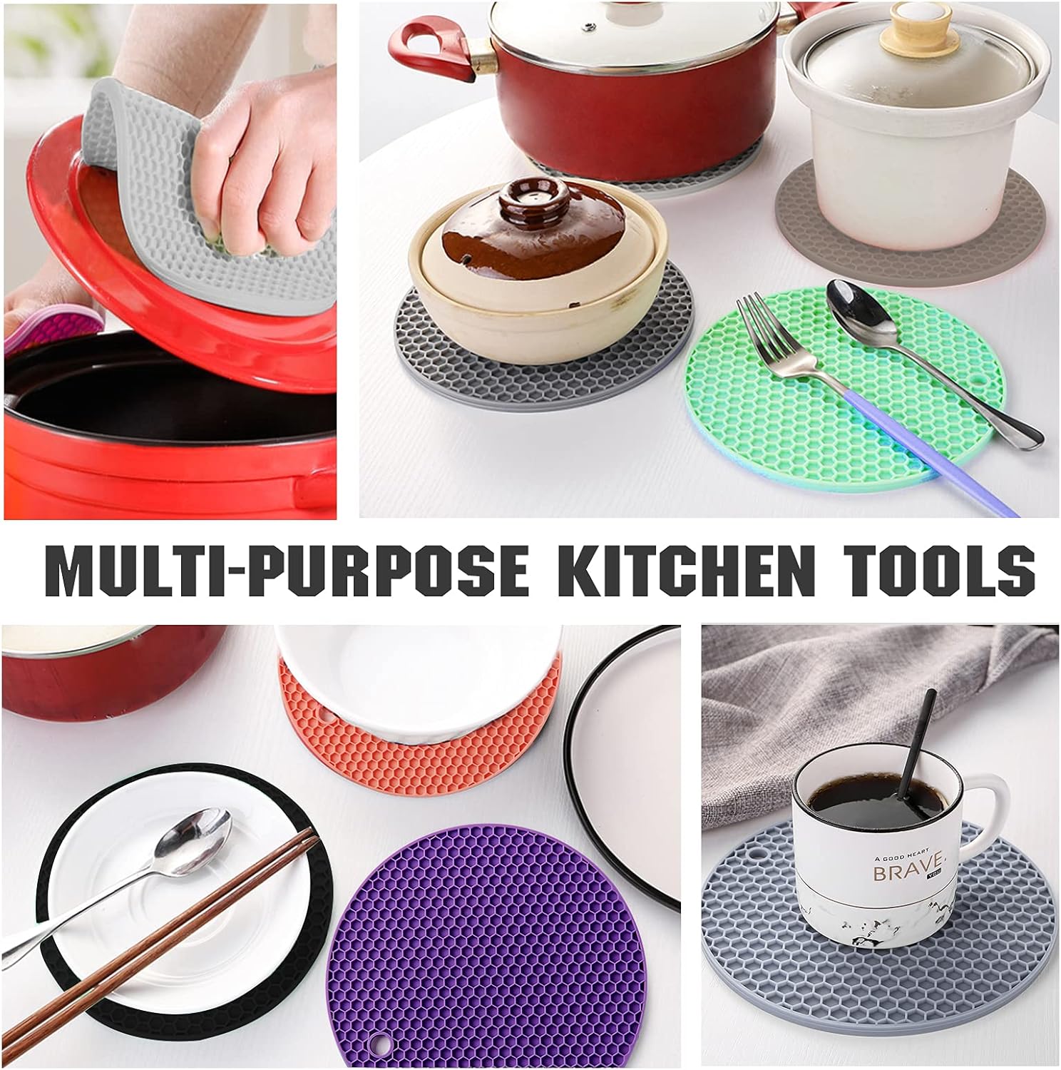 - MULTI-PURPOSE KITCHEN TOOLS: Each trivet has a corner hole for convenient hanging storage and can be used as a coaster, drying mat, jar opener gripper pad, spoon holder, garlic peeler, and potholder mats.