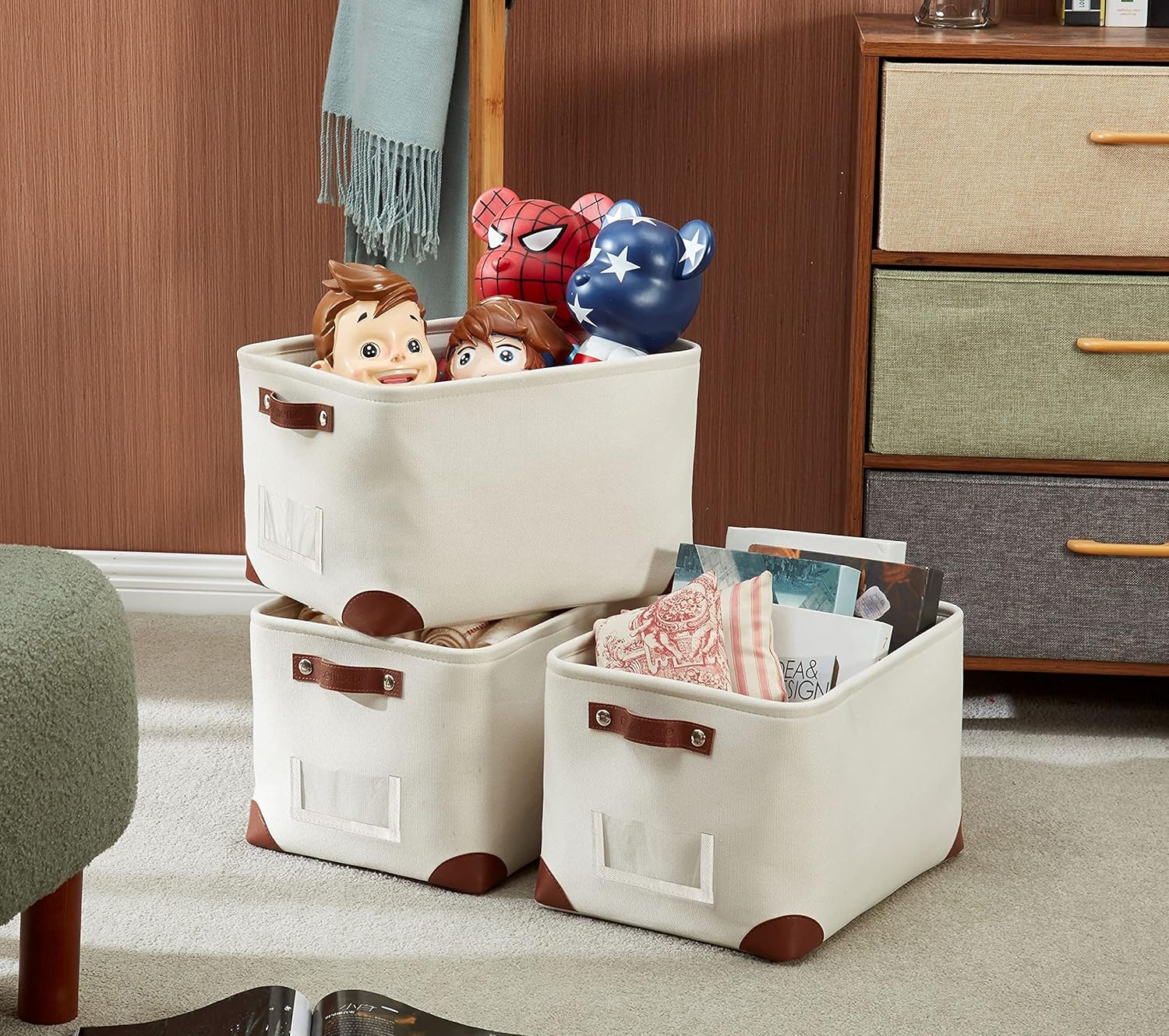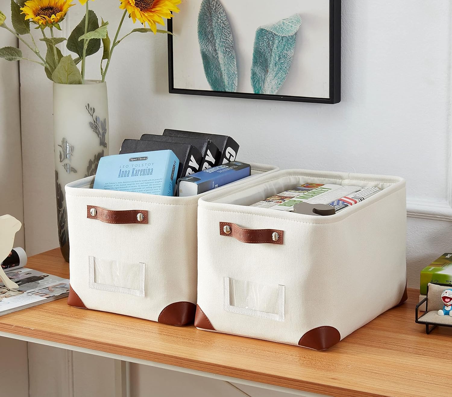 • Label & Organize: This basket features a label holder to help you find items without pulling out the bins each time. The luxurious canvas exterior fabric, faux leather handles and corner feet are designed for a modern and elegant feel.