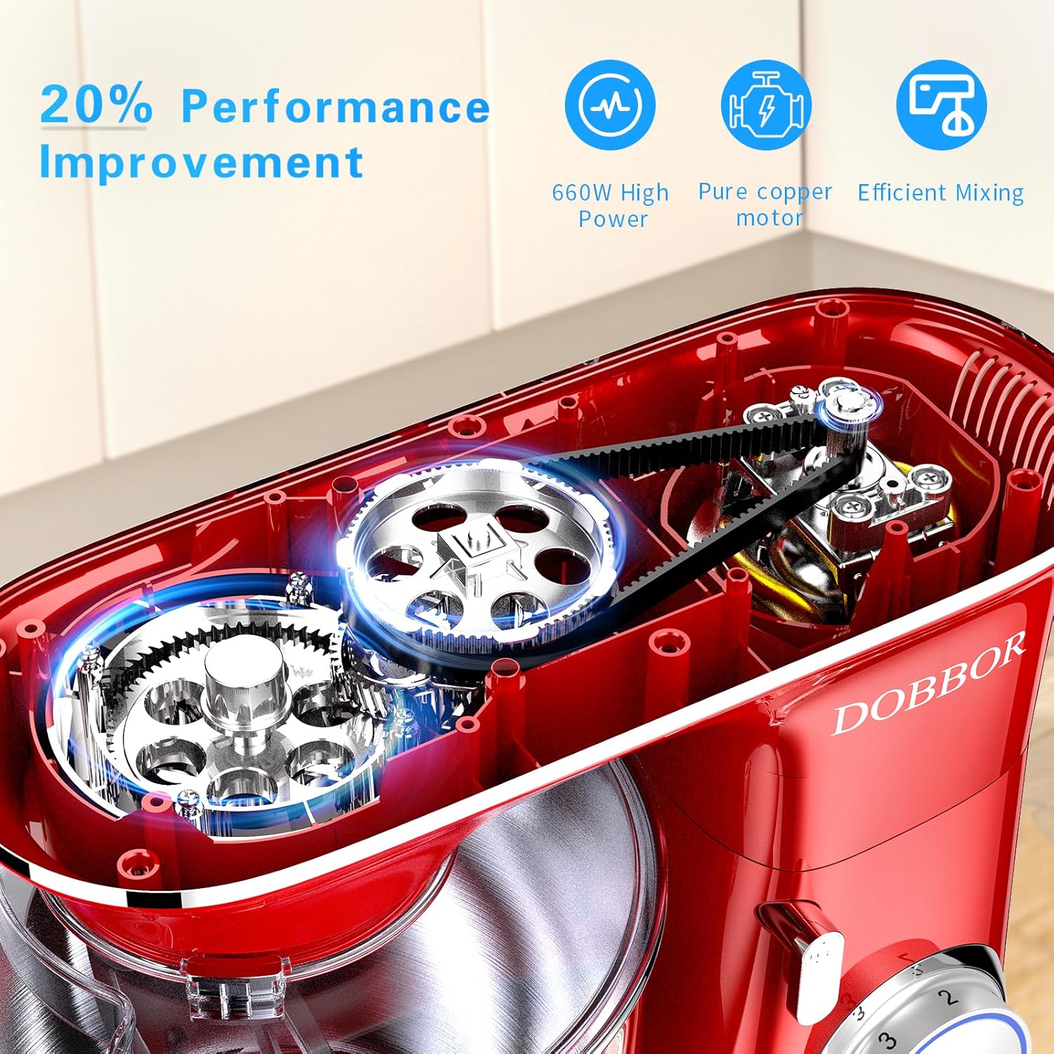 DOBBOR Electric Stand mixer, 9.5QT 660W 7 Speeds Tilt-Head Dough Mixers, Bread Mixer with Dough Hook, Whisk, Beater, Splash Guard for Baking Bread, Cake, Cookie, Pizza, Muffin, Salad and More - Red