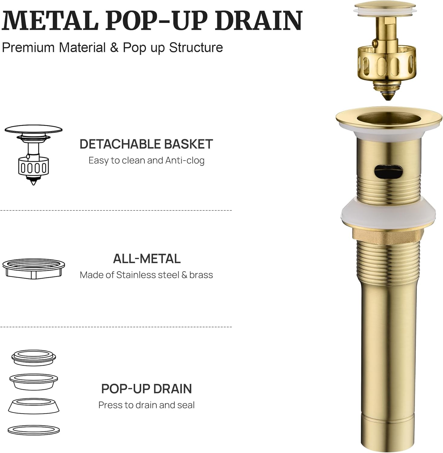 - HIGH QUALITY: Metal quality sink drain stopper for you, It is well made of high quality brass and stainless steel, all of the accessories are of the highest quality