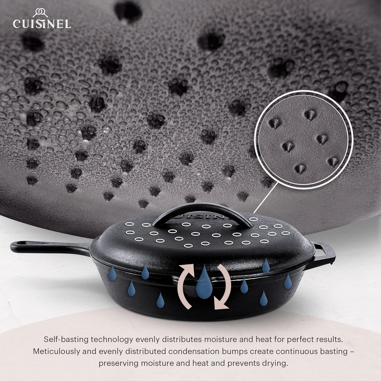 - NOW WITH A HEAVY DUTY CAST IRON BRAISER LID – Cuisinel once again revolutionizes the culinary world by introducing a braising cast iron lid to our famous 12"-inch fry pan. With our meticulously placed drip-points in the lid, even moisture and heat distribution, you can now truly take your cast iron wizardry to the next level by effectively turning your pan into a casserole or braiser with perfect cooking results. Pan and lid can withstand any temperatures without fear of shattering or cracking.