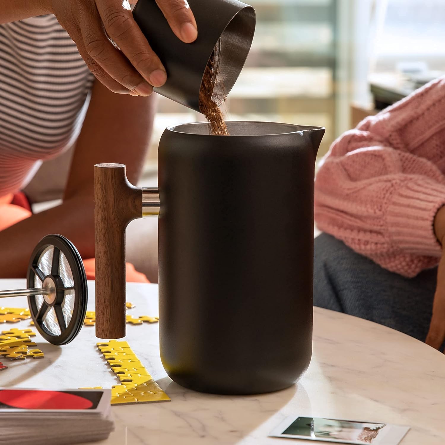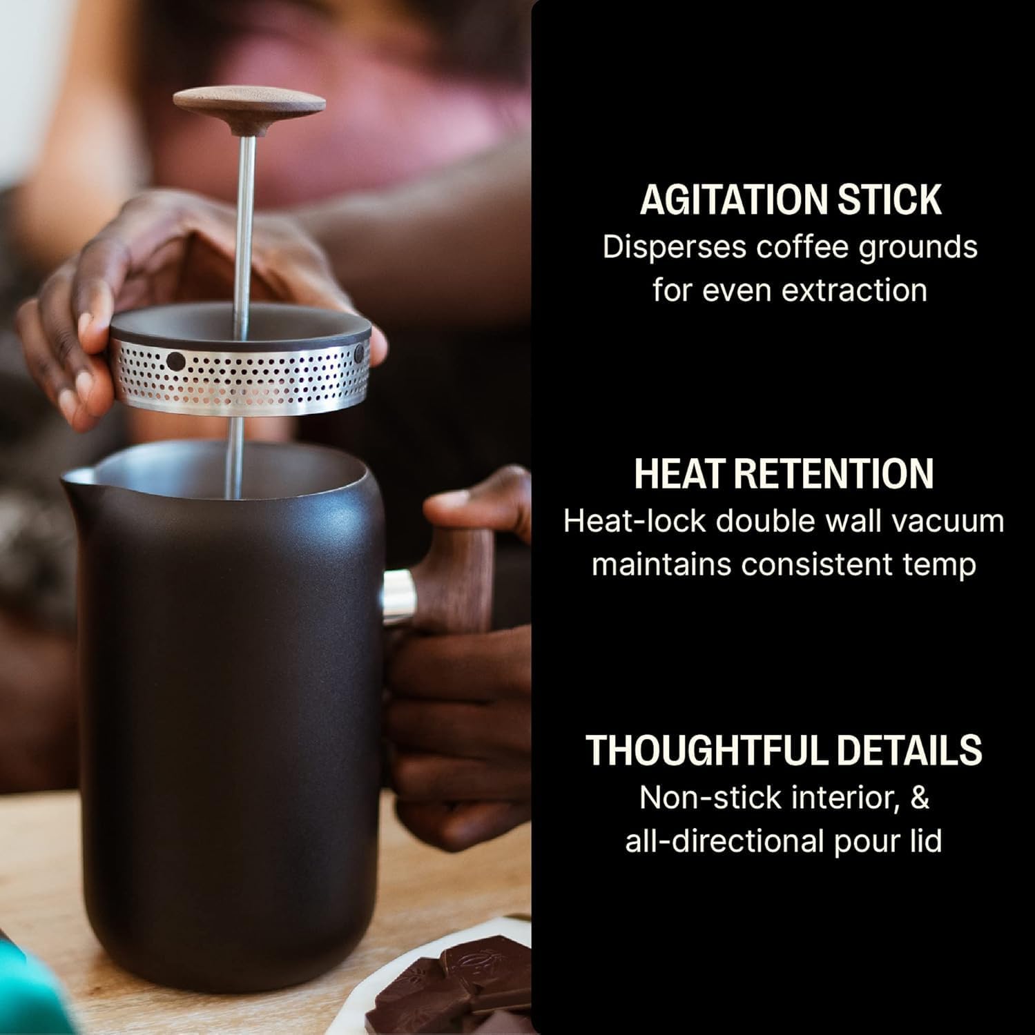 Fellow Clara French Press Coffee Maker - Portable Stainless Steel Coffee Press, Insulated Manual Brewer, Matte Black with Walnut, 24 oz Carafe