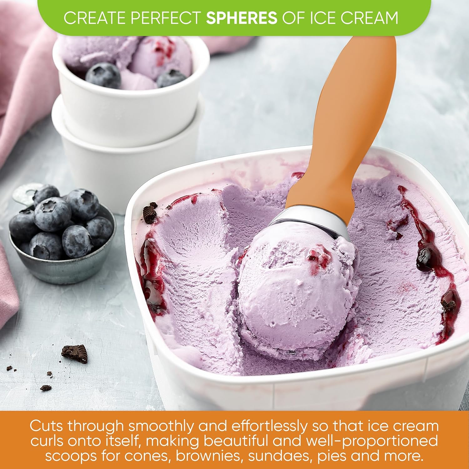 - Create Perfect Spheres Of Ice Cream - Cuts through smoothly and effortlessly so that ice cream curls onto itself, making beautiful and well-proportioned scoops for cones, brownies, sundaes, pies and more.