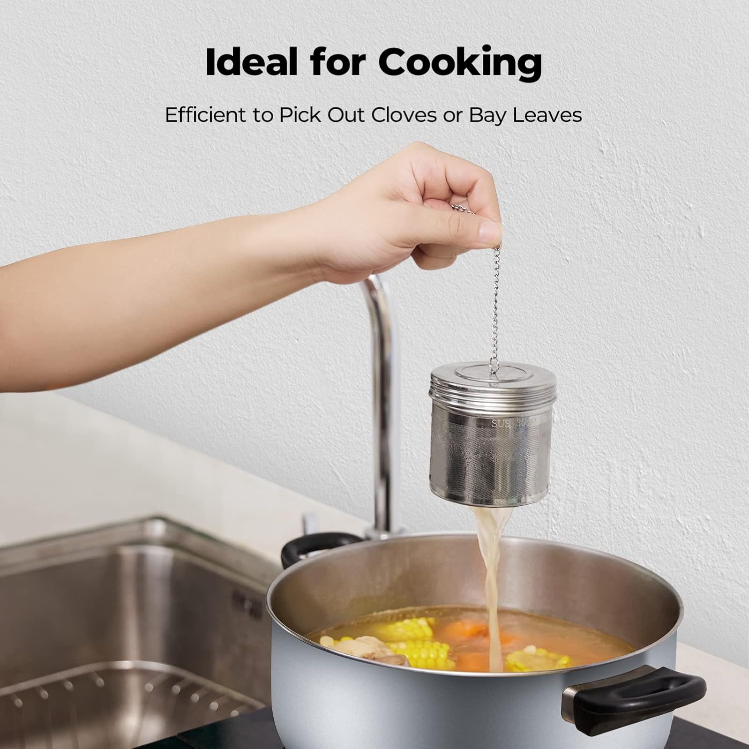 - Wide Application: Comes with 2 loose leaf tea infusers, one for making tea, the other one for cooking. With Extended 7.8'' chains with hook, the large tea steeper can catch securely on any rim of large pitcher, pan, pot, tea kettle or teapot. [Notice]: Ensure the diameter of your container is less than 3.2" to accommodate the infuser's lid diameter
